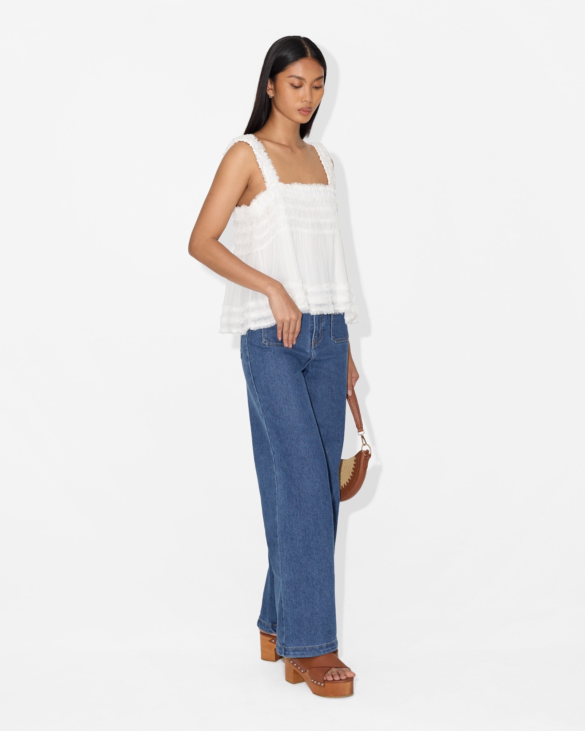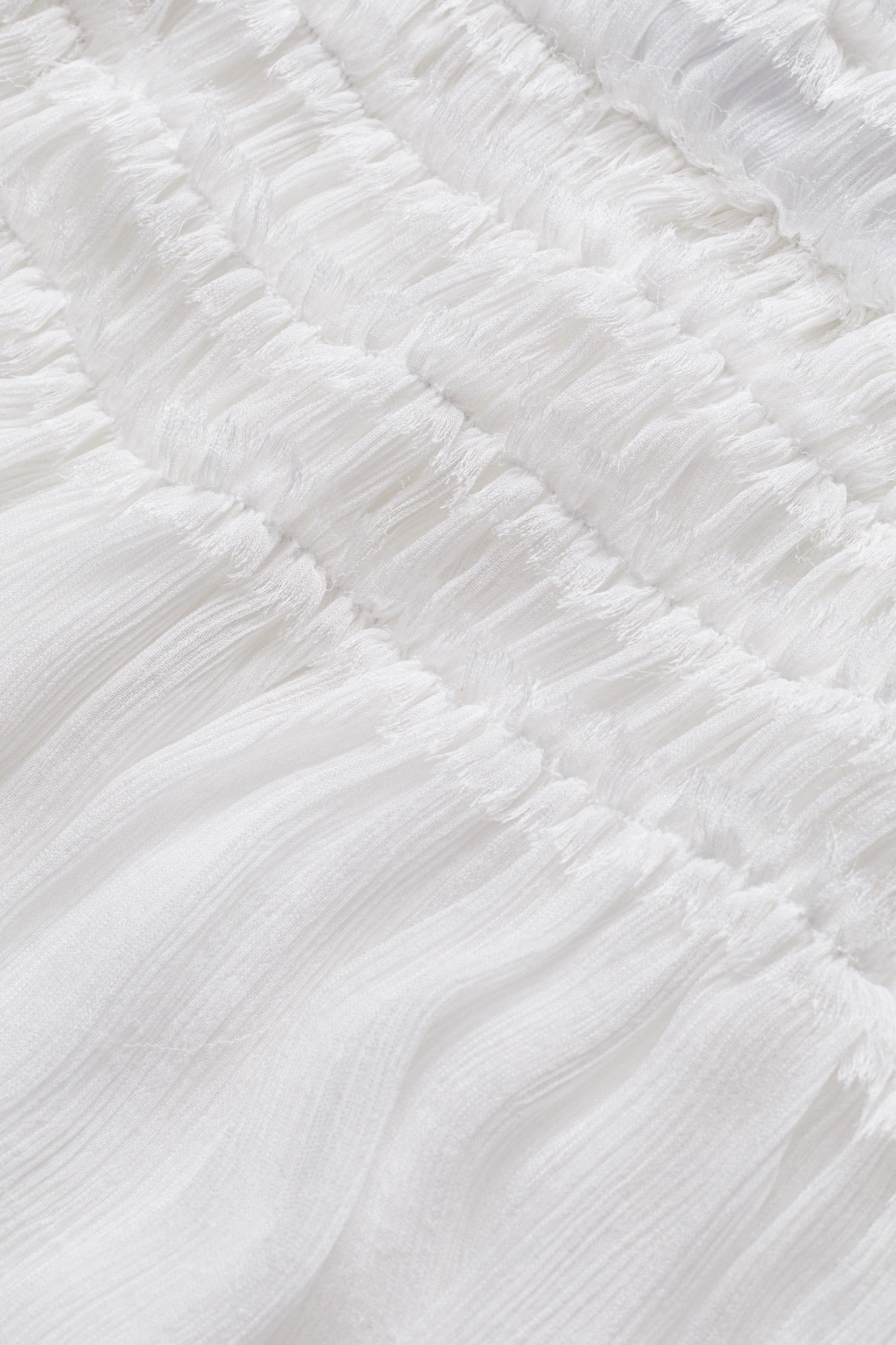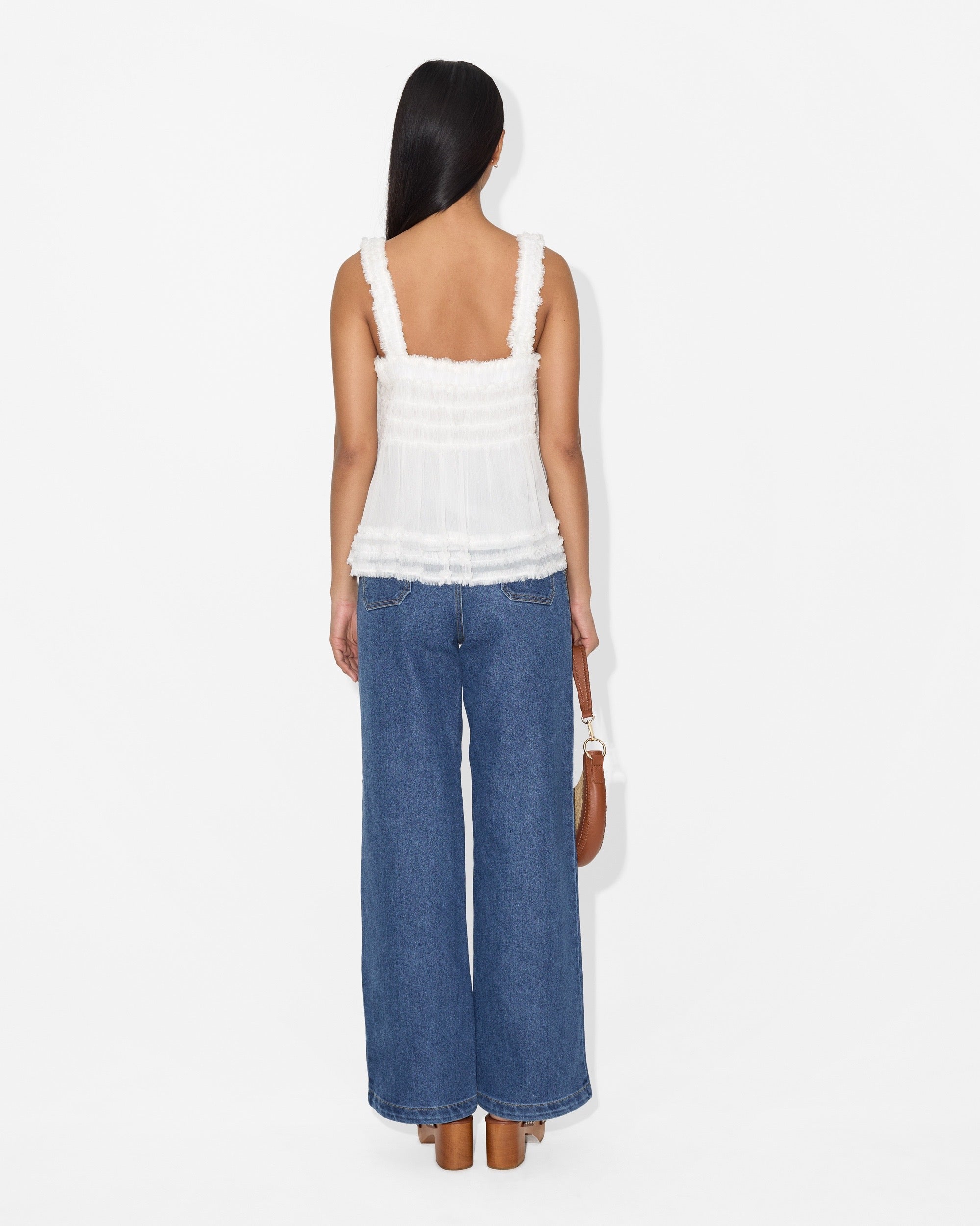 Note: The raw-cut frill finish is an intentional design detail. Loose threads may appear over time and are not considered a manufacturing defect.