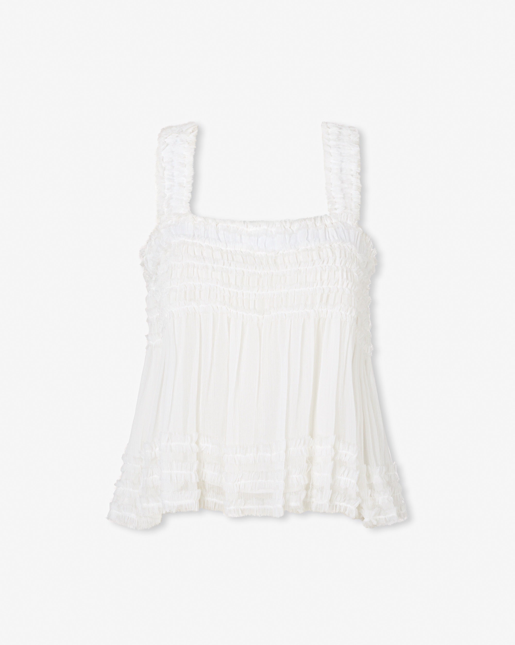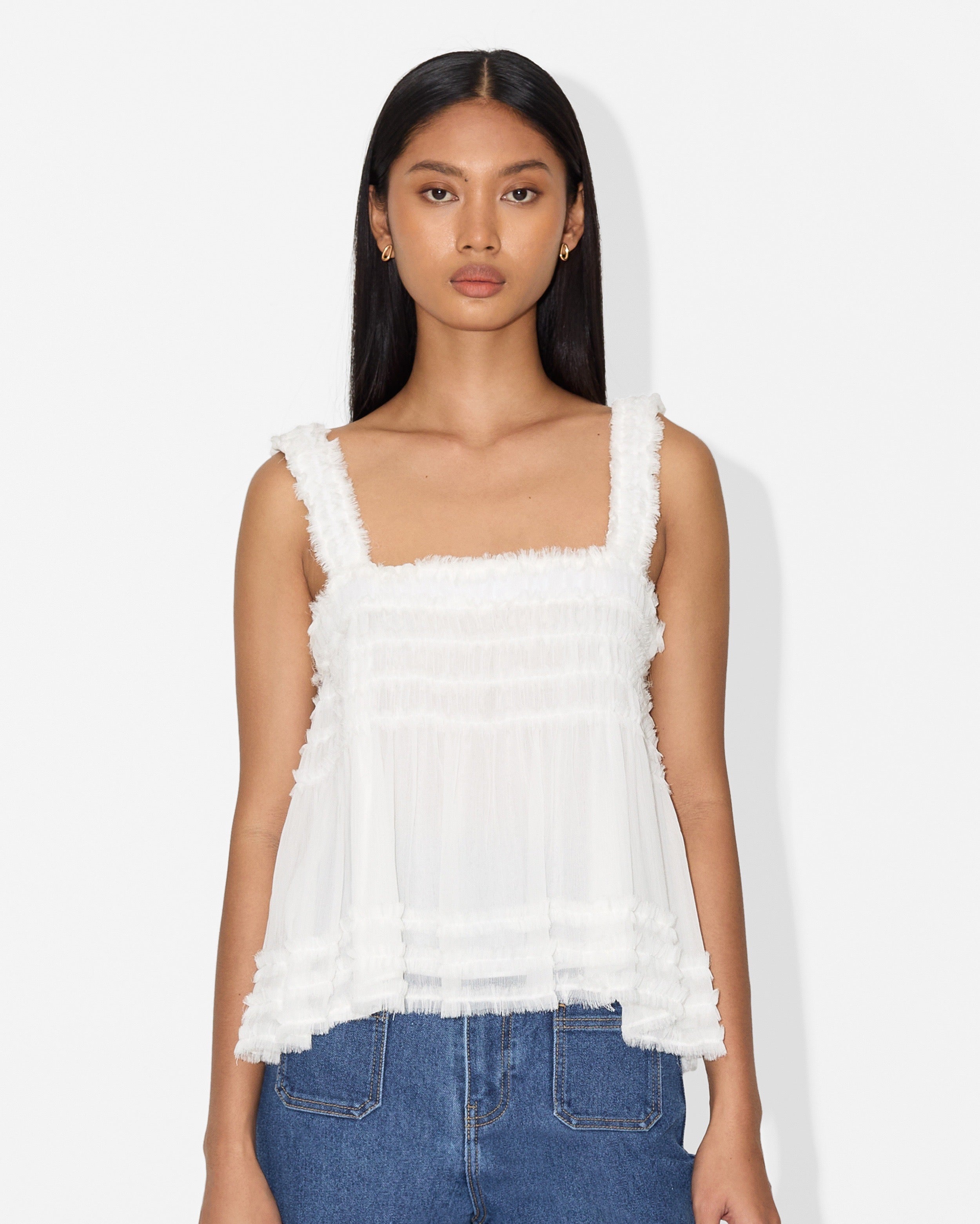 The Alegria Top embodies effortless femininity with its soft texture and delicate frill details. Designed with a relaxed silhouette and gathered bodice, the piece offers comfort while maintaining a light, playful charm.