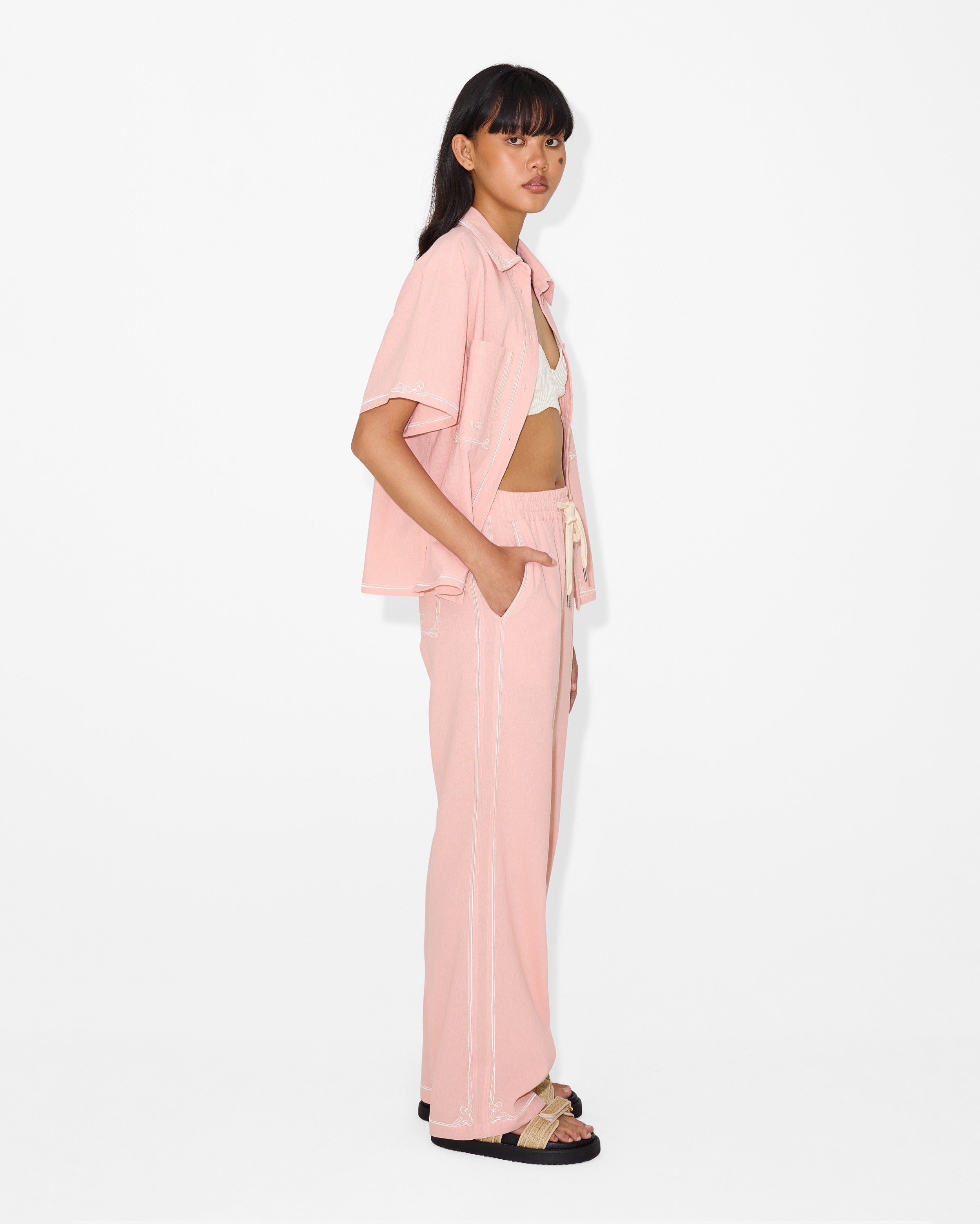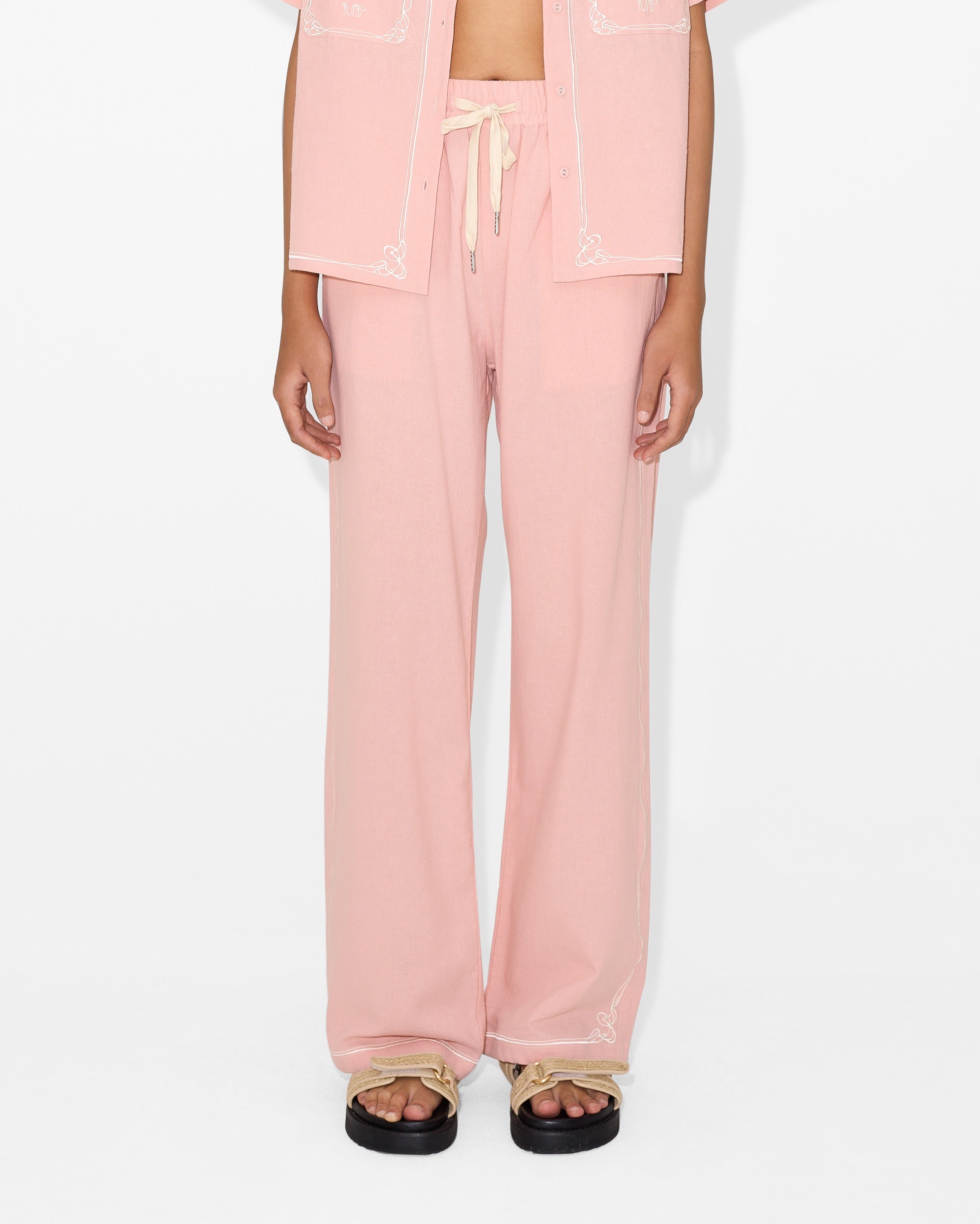 Inspired by the Art Nouveau elegance of the 1920s, these pants' vintage pastels and intricate embroidery are reimagined for a day by the water. Their comfortable, relaxed fit and sophisticated details make them the perfect choice for a chic, resort-ready look.