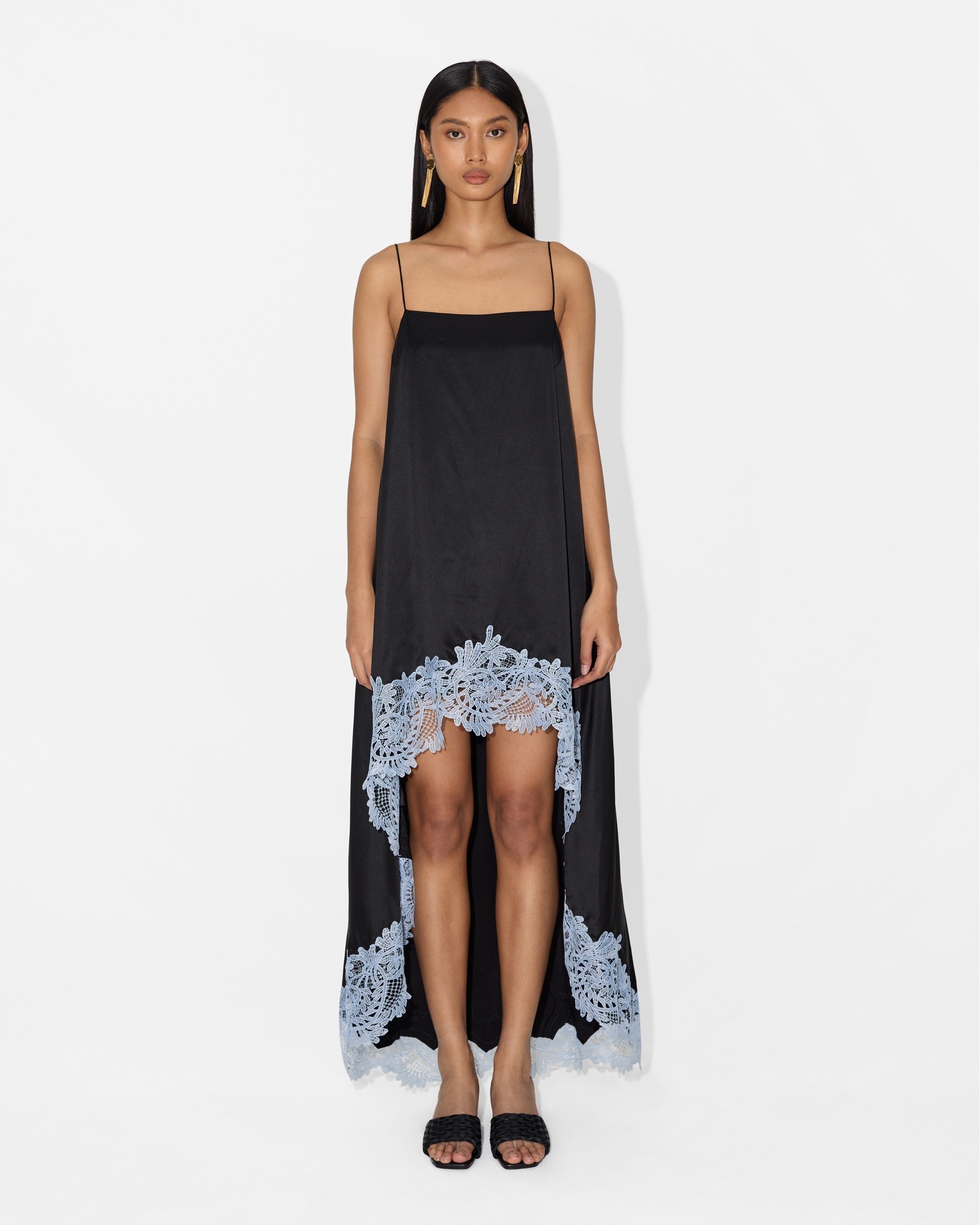 The Carrie Dress embodies understated elegance with its fluid silk silhouette and graceful movement. Designed with a relaxed A-line shape and finished with delicate lace edging, the piece offers a refined balance of softness and sophistication.