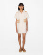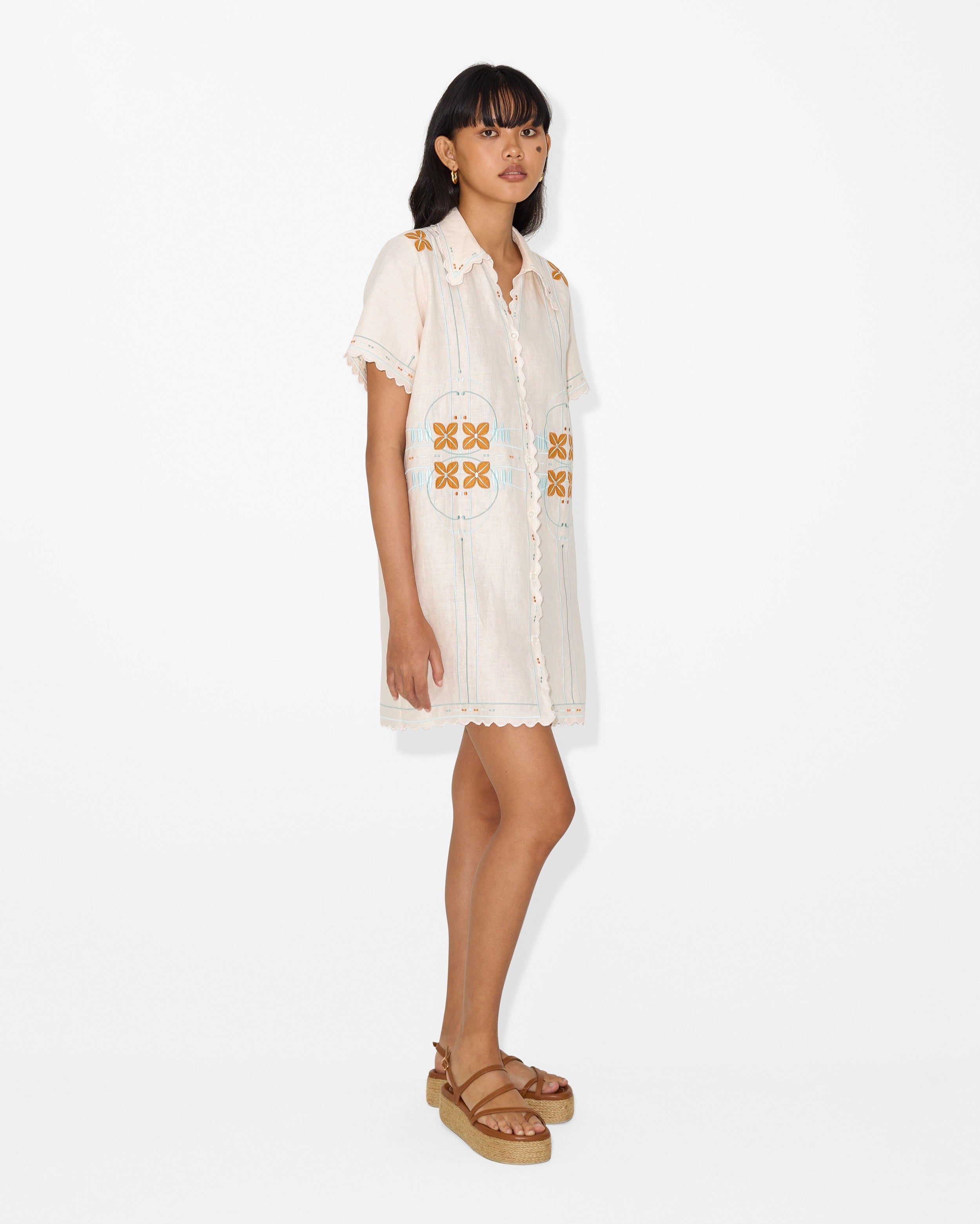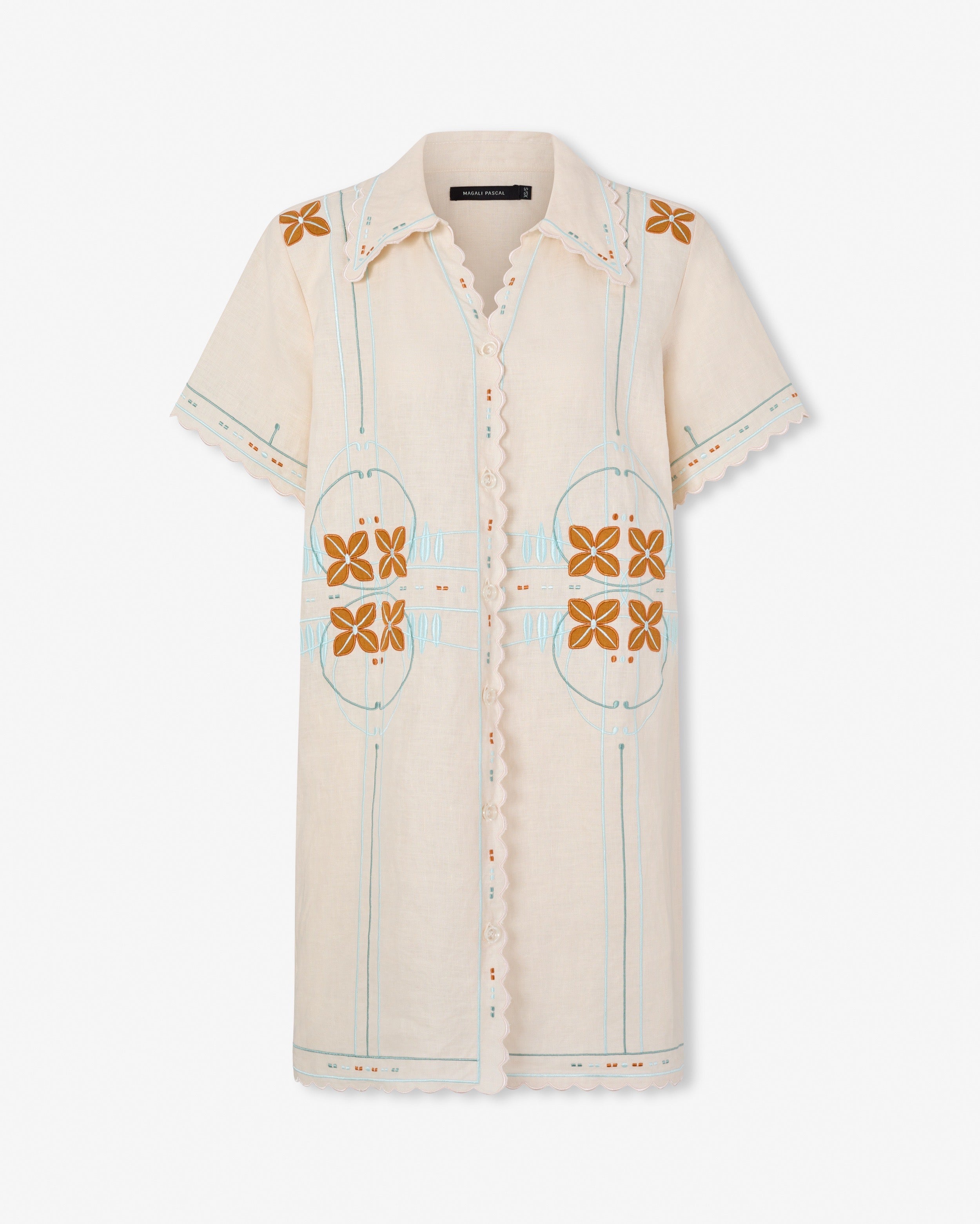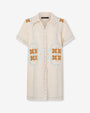 The Charles Applique Embroidery, with its bold graphic look, is inspired by the artistic elegance of Paris's Belle Epoque, reimagined with a modern edge. This design plays with transparency and volume, creating a look that is both dramatic and decorative. This shirt dress, with its clean lines and intricate detail, embodies a new era of expression.