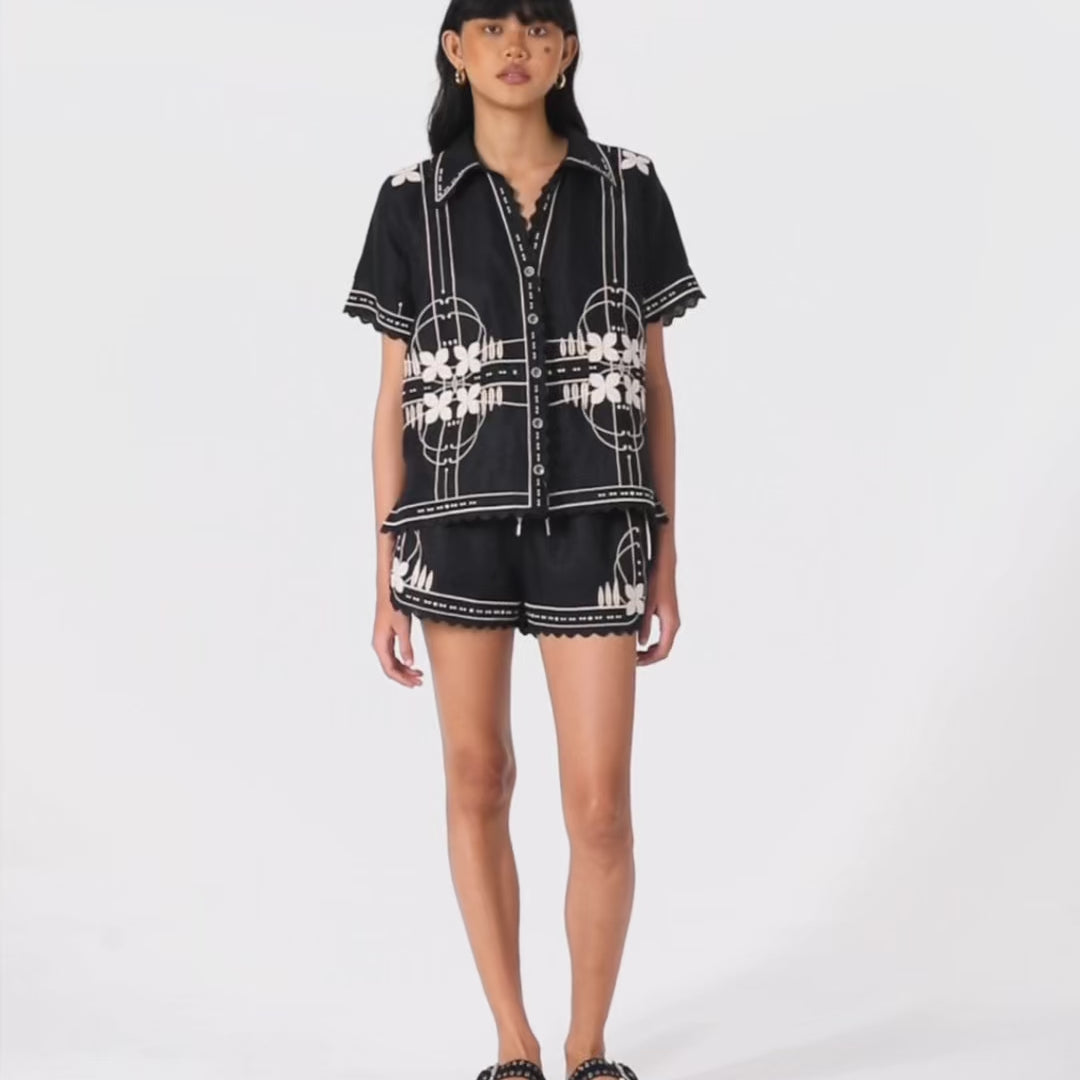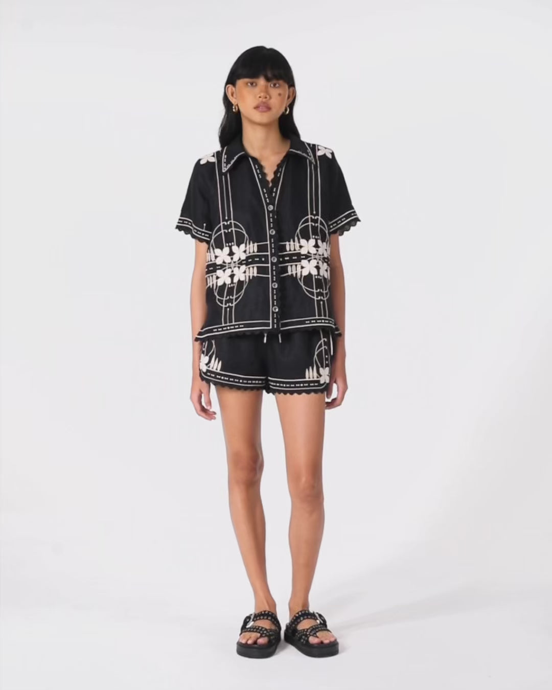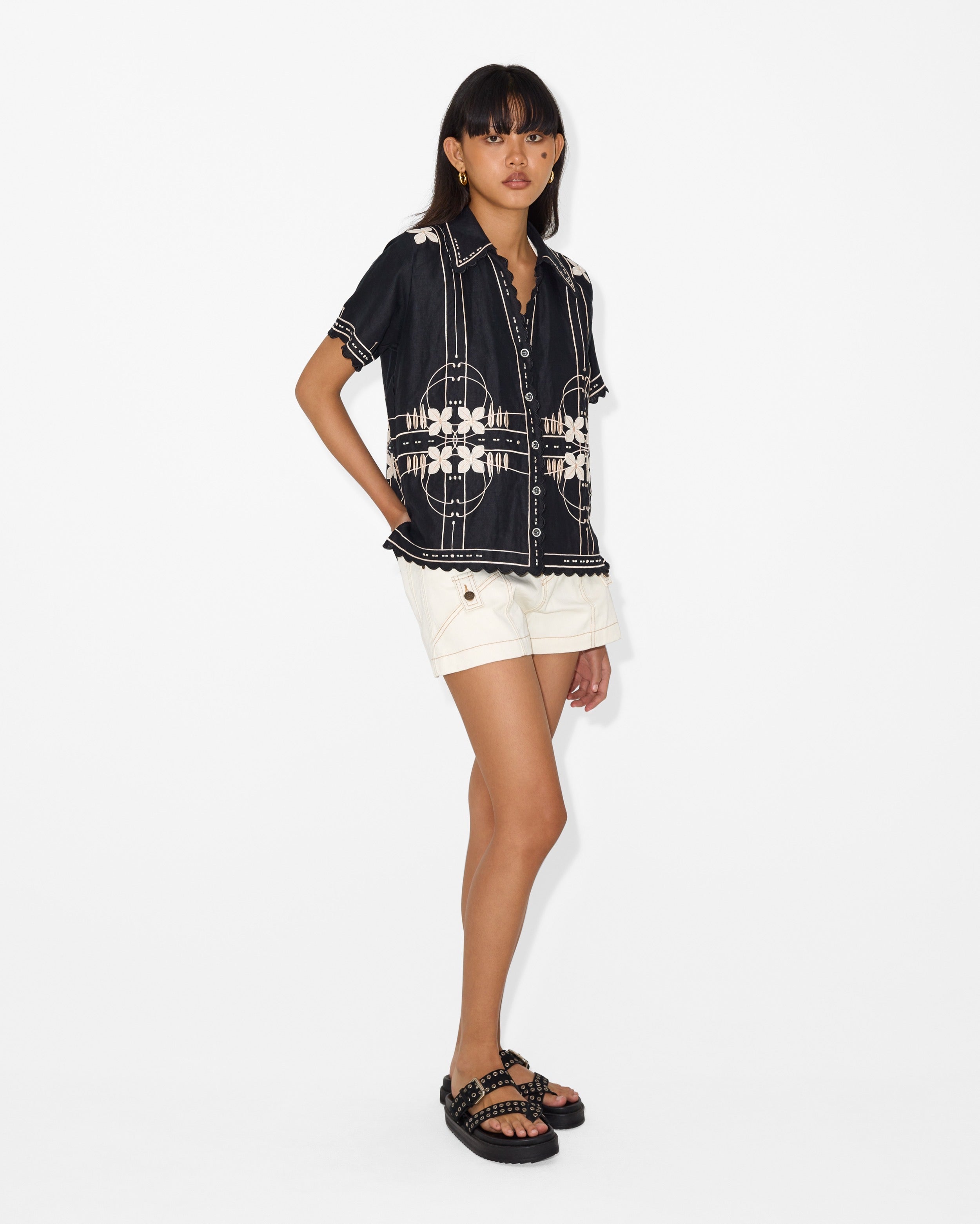 The Charles Applique Embroidery, with its bold graphic look, is inspired by the artistic elegance of Paris's Belle Epoque, reimagined with a modern edge. This design plays with transparency and volume, creating a look that is both dramatic and decorative. This shirt, with its clean lines and intricate detail, embodies a new era of expression.