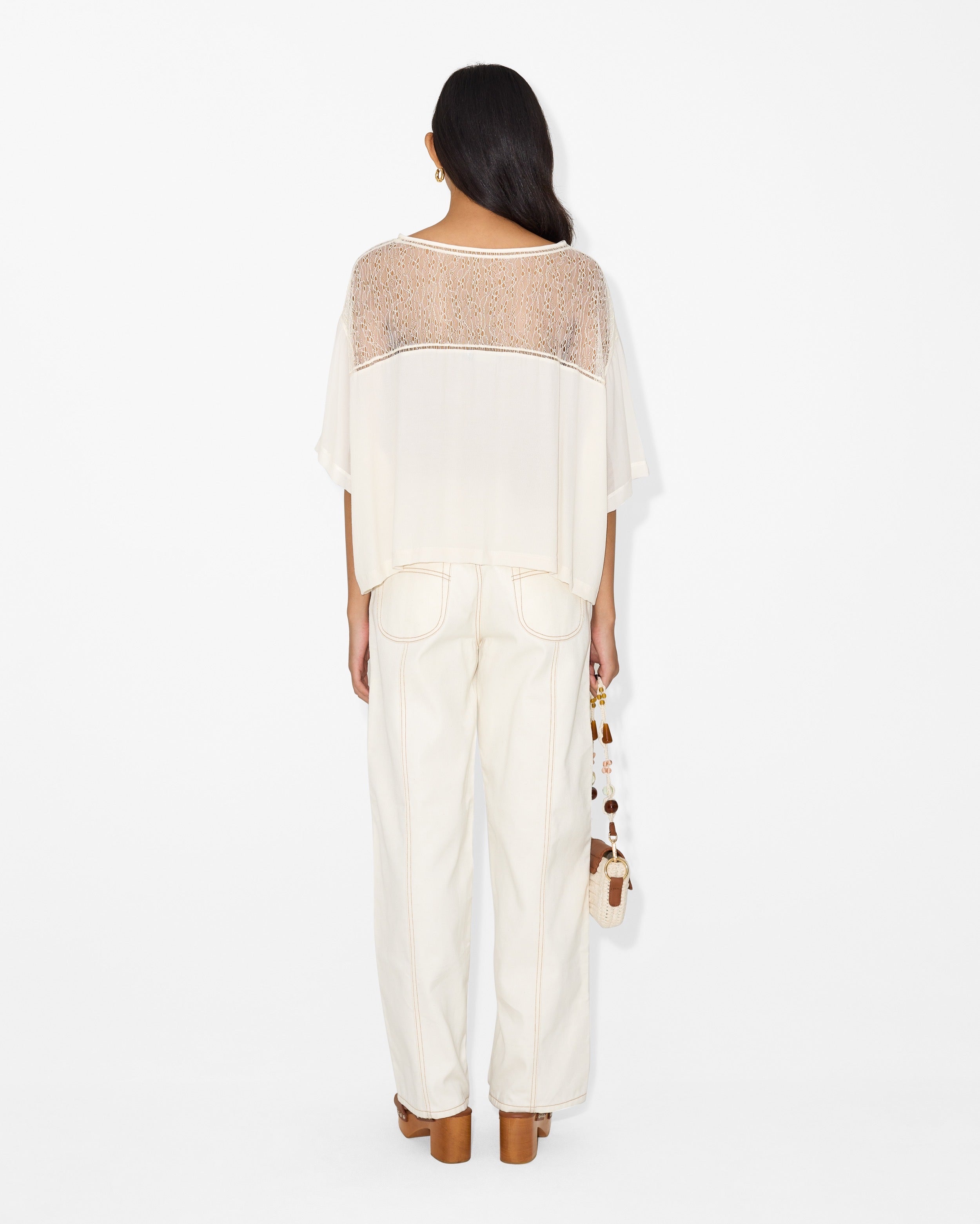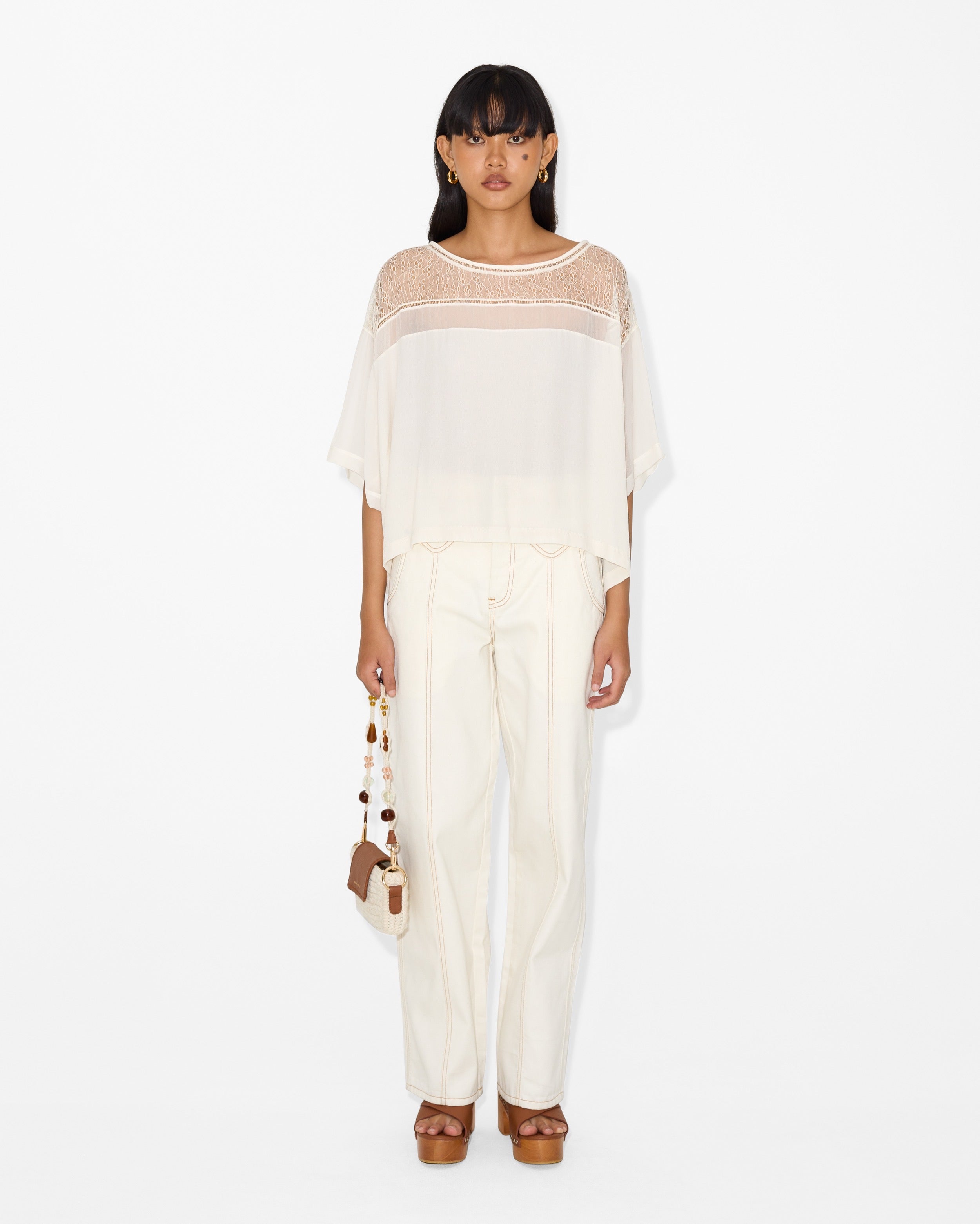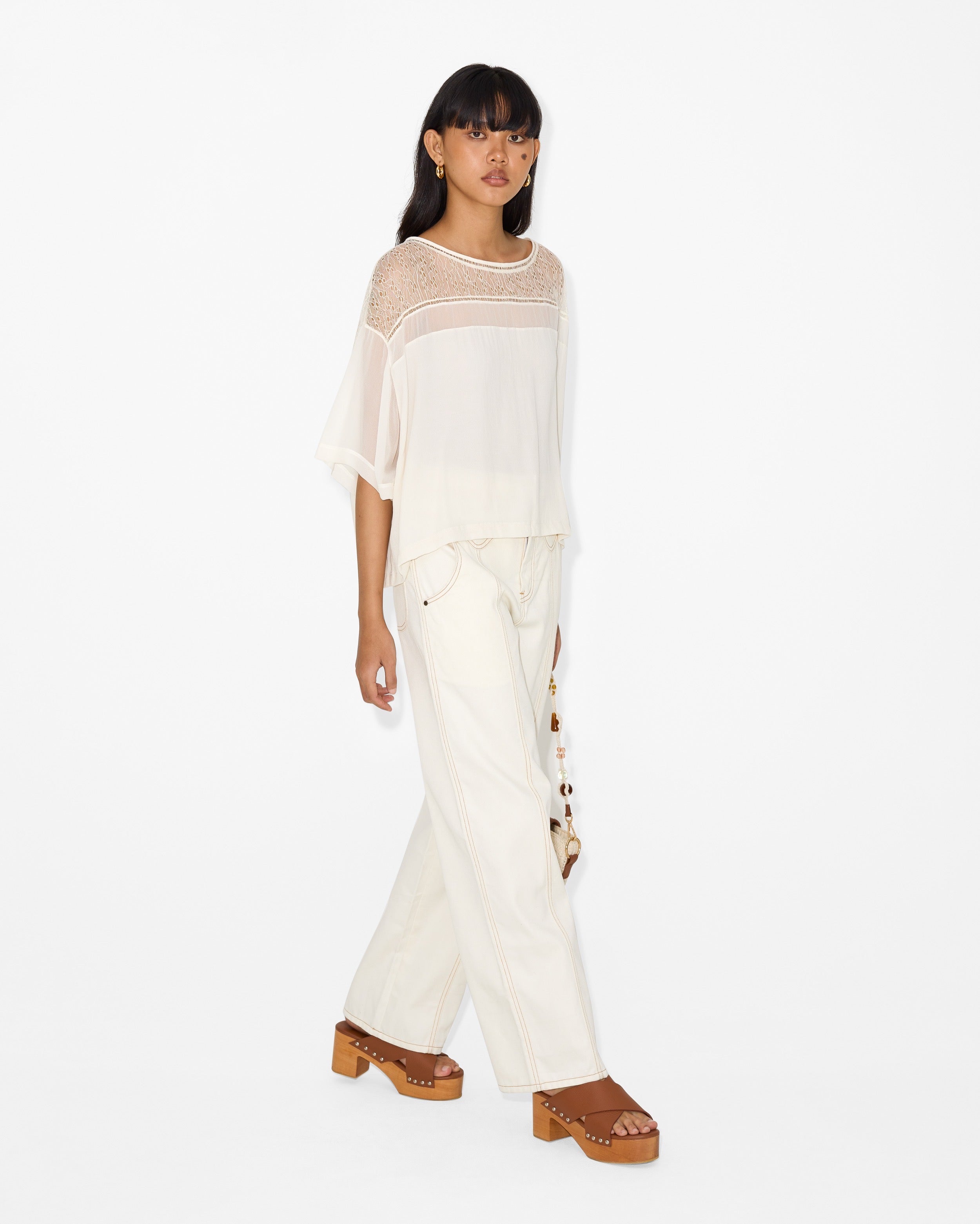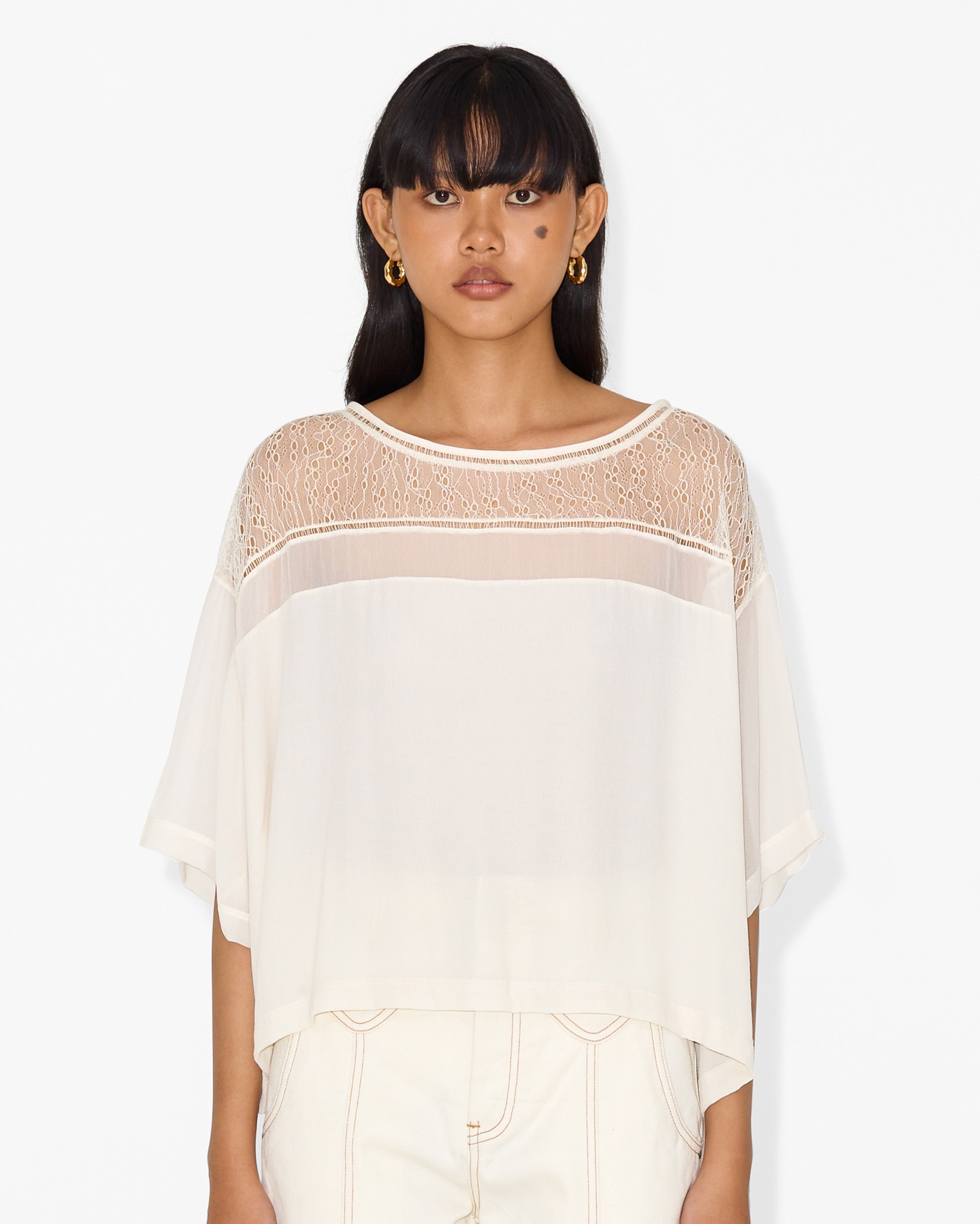 This elevated basic redefines the classic t-shirt by merging casual comfort with high-end detail. The Charlie T-shirt plays with the juxtaposition of a flowing, oversized silhouette and a sheer lace-like texture, creating a look that is both effortless and alluring.