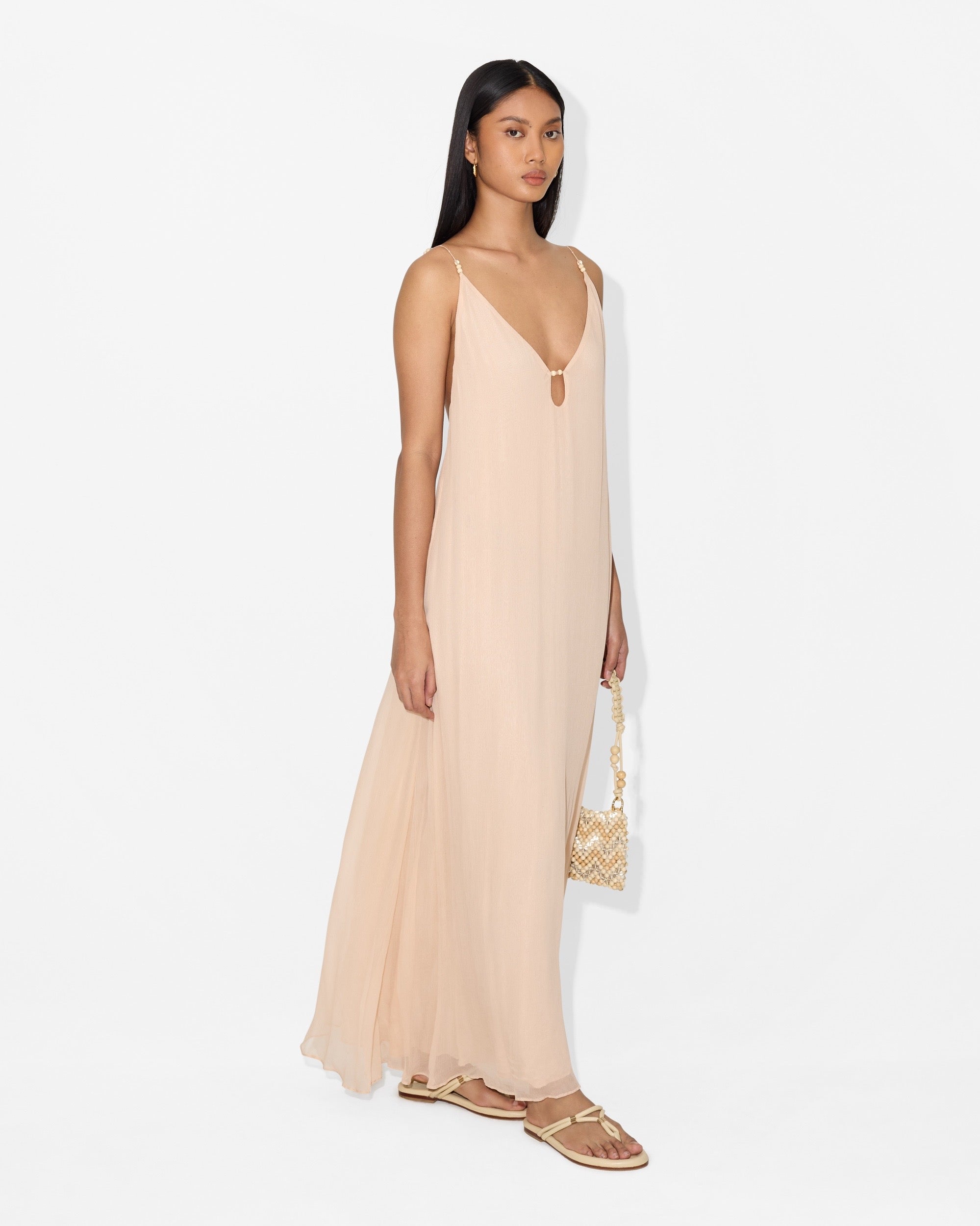 The Fernanda Maxi Dress in signature viscose yoryu is inspired by vintage beaded curtains, evoking a soft nostalgia of Brazilian interiors with delicate bead details and a fluid silhouette.