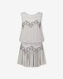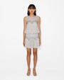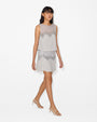 The Fuji Mini Dress takes the glamour of the Art Deco era and reimagines it for a fun, contemporary style. The contrast of the intricately beaded, sheer top and the playful, thigh-length skirt creates a striking look that is both elegant and modern.