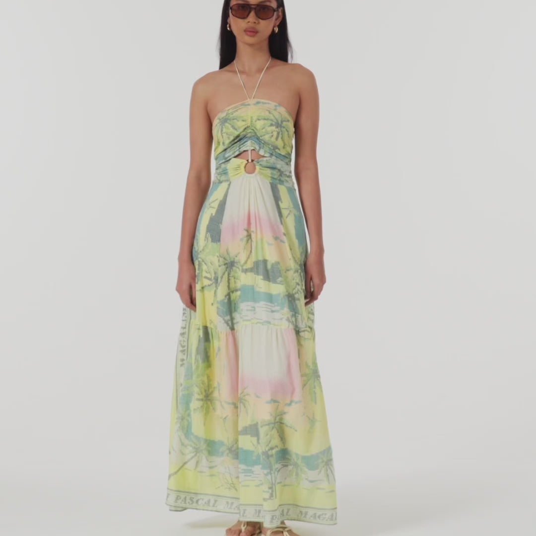 The Ipanema Maxi Dress captures the vibrant spirit of Brazil’s iconic coastline through the joyful Ipanema Print. A vivid trompe-l’œil screen print mimics delicate cross-stitch, bringing a sun-soaked beach scene to life.