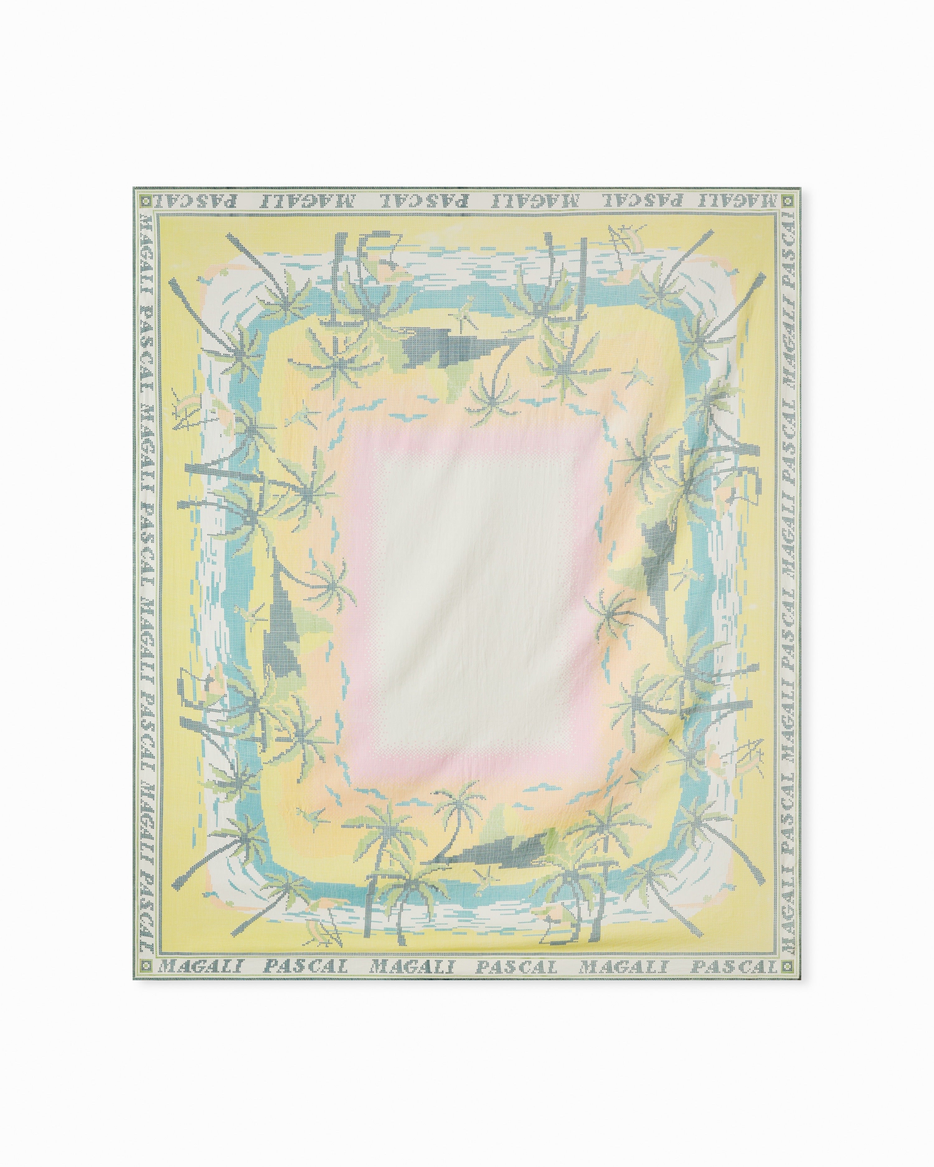 The Ipanema Sarong brings the vibrant spirit of Brazil’s coastline to life with the joyful Ipanema Print. A vivid trompe-l’œil screen print mimics delicate cross-stitch, capturing a sun-soaked beach scene framed by palm trees and soft coastal hues.