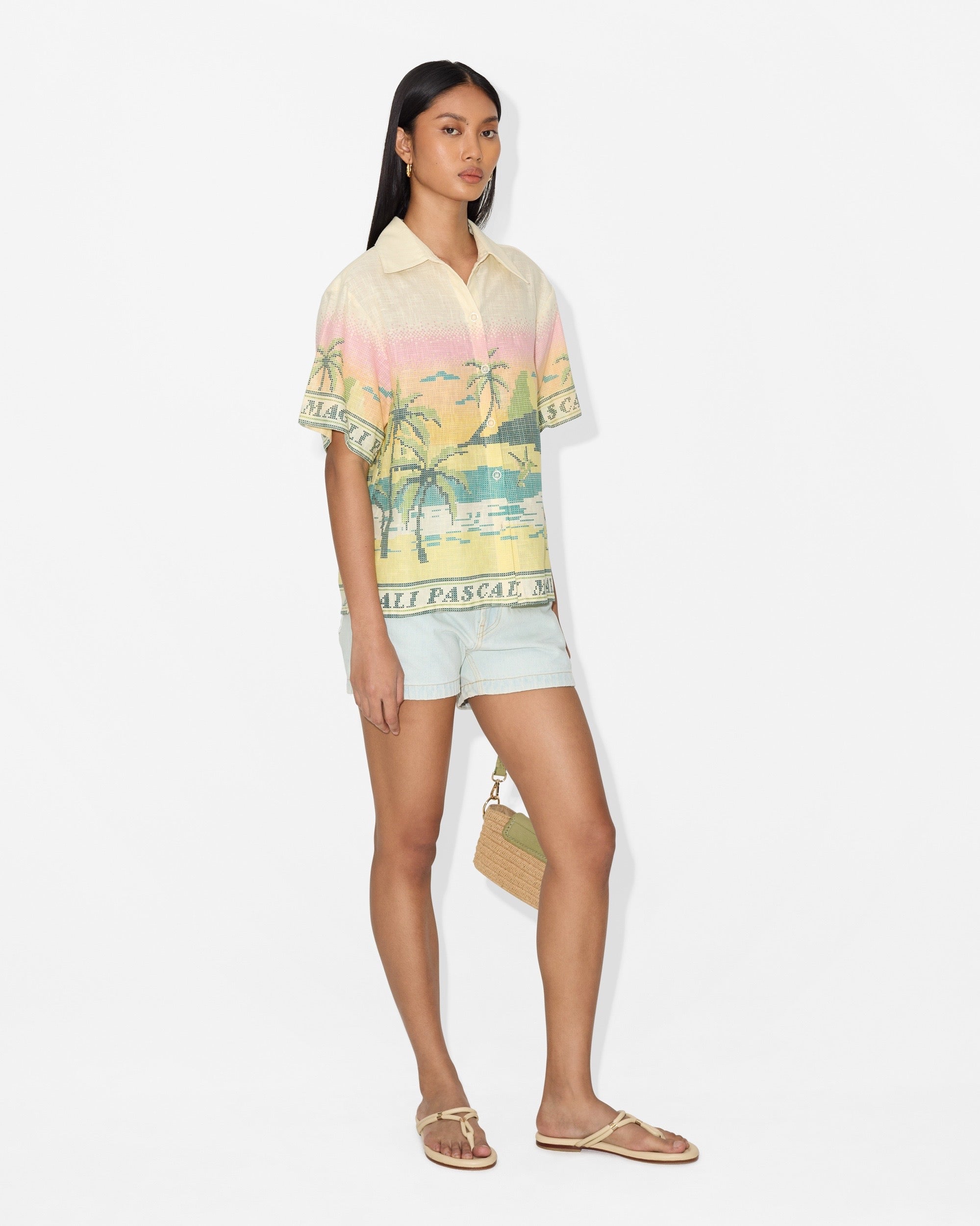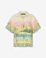 The Ipanema Shirt celebrates the vibrant rhythm of Brazil’s most iconic beach. Featuring the Ipanema Print, a vivid trompe-l’œil screen print that mimics delicate cross-stitch, the design captures a sun-soaked seaside scene with palm trees and lounge chairs brought to life in joyful color.
