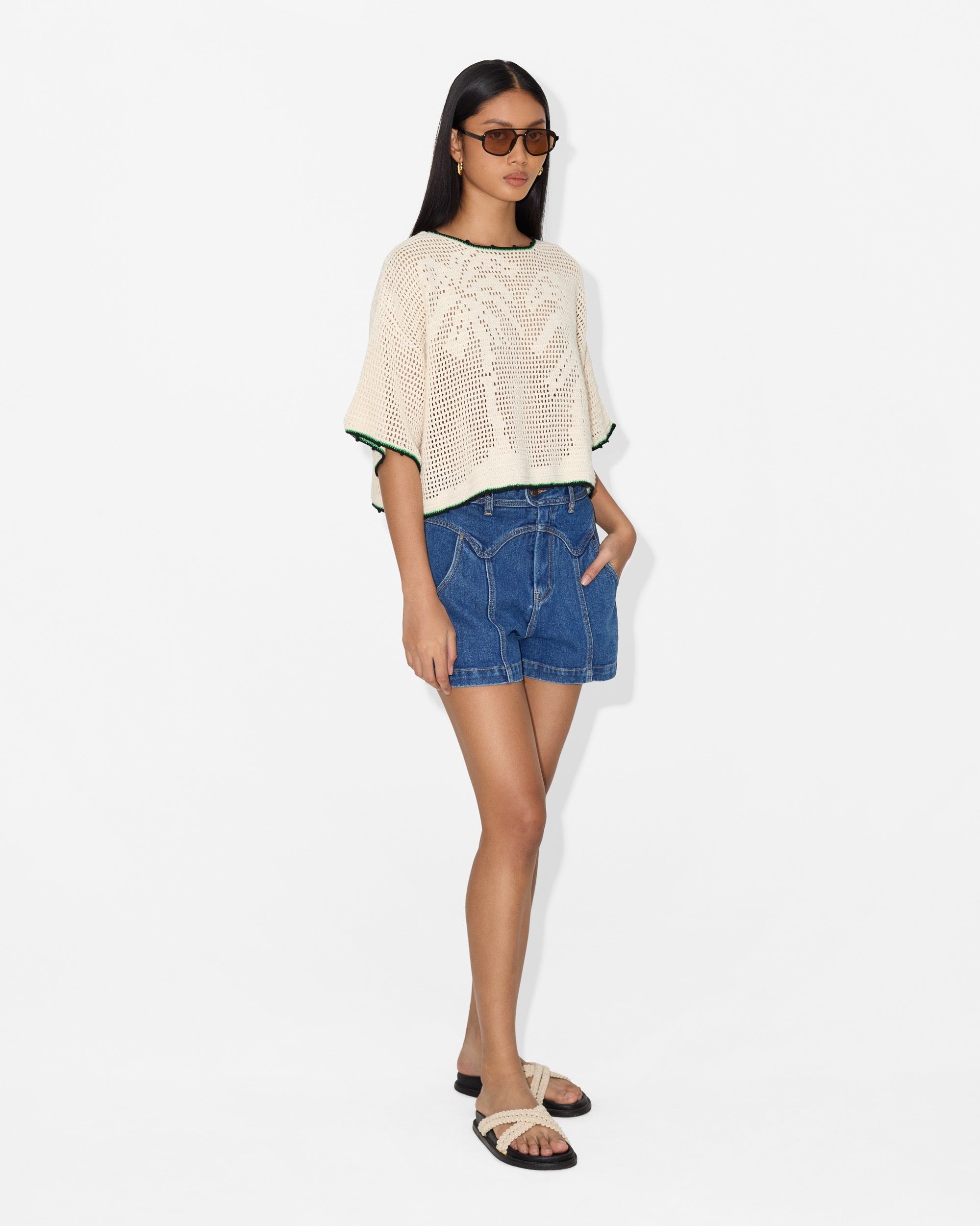 Sheer crochet texture with cropped length.