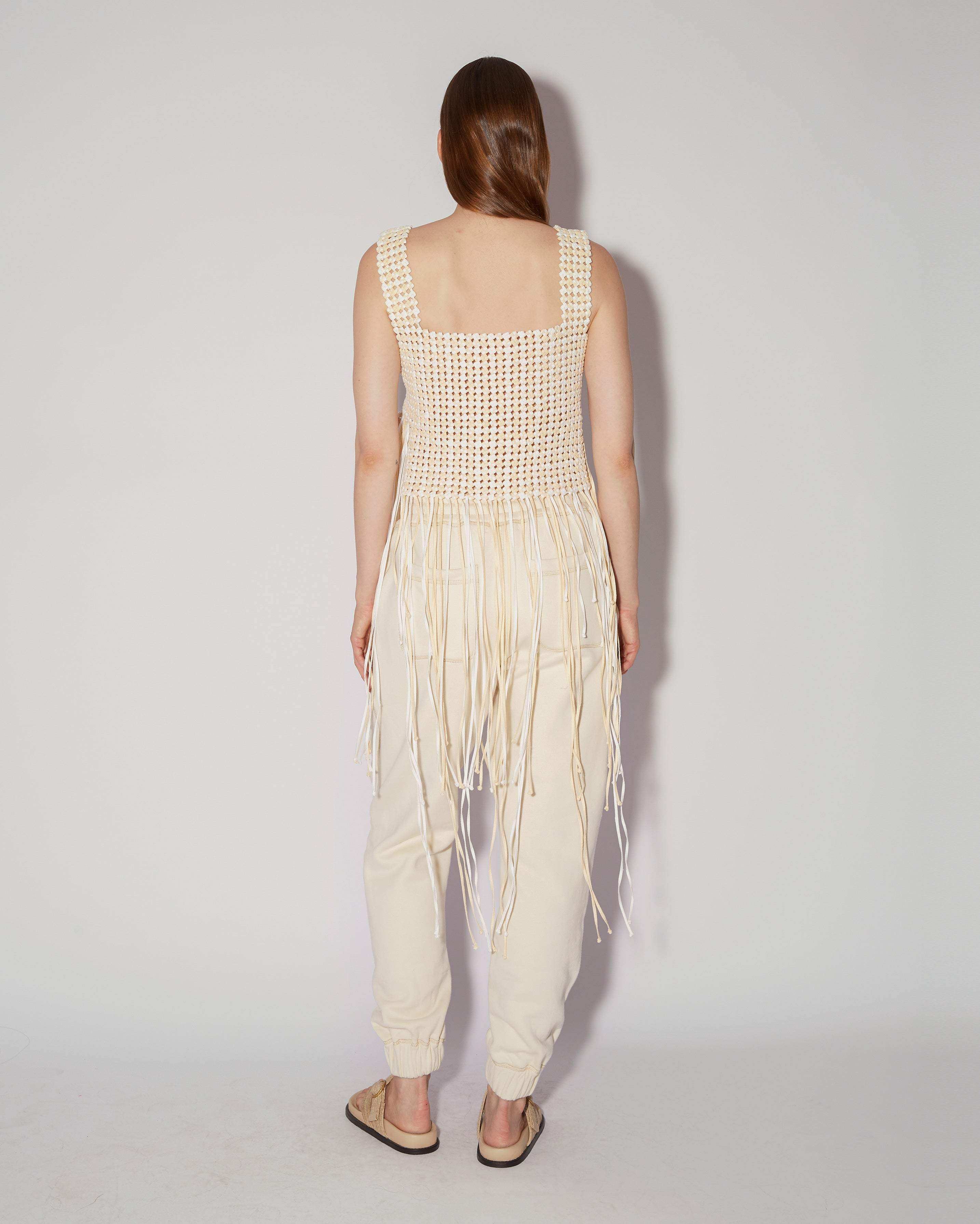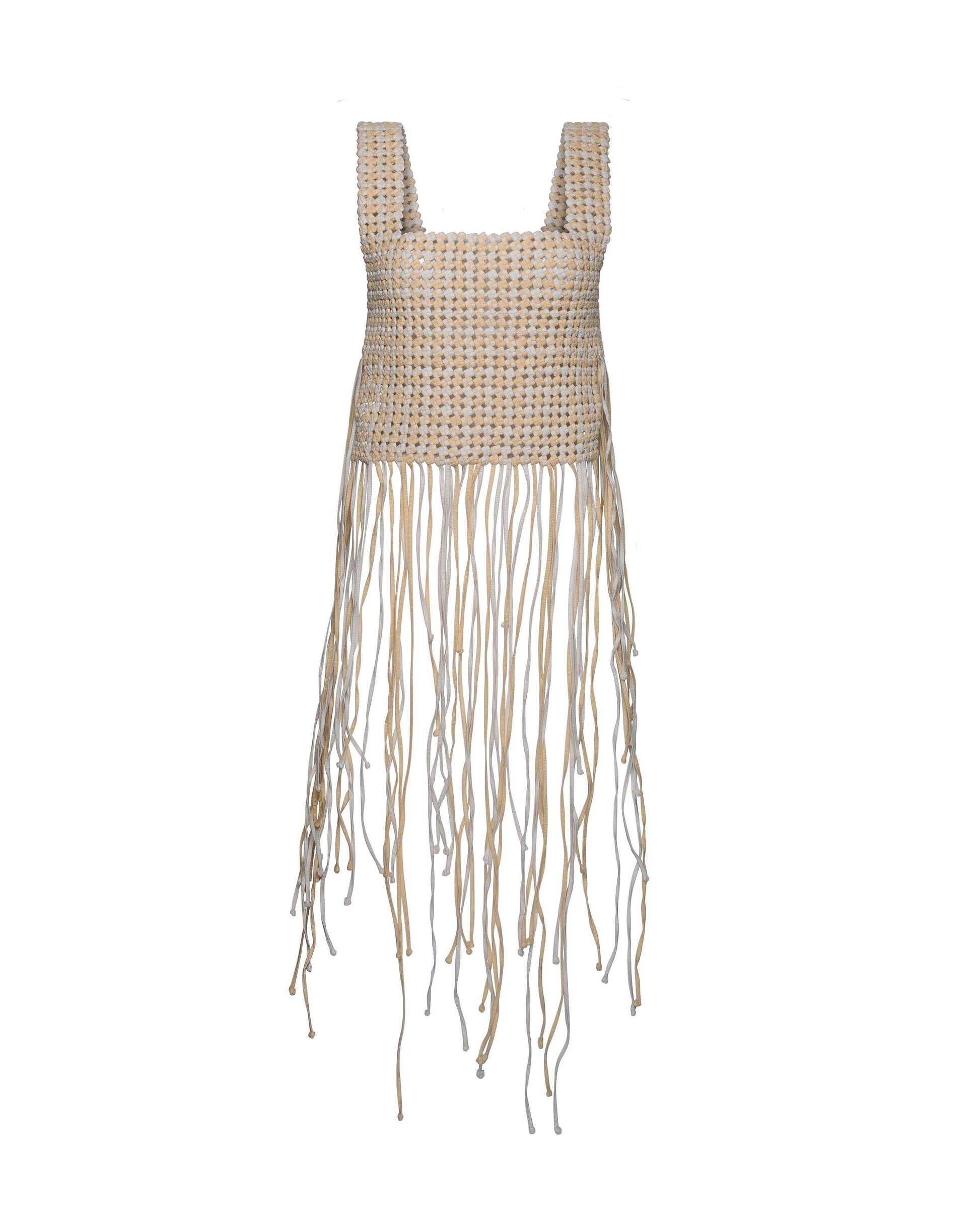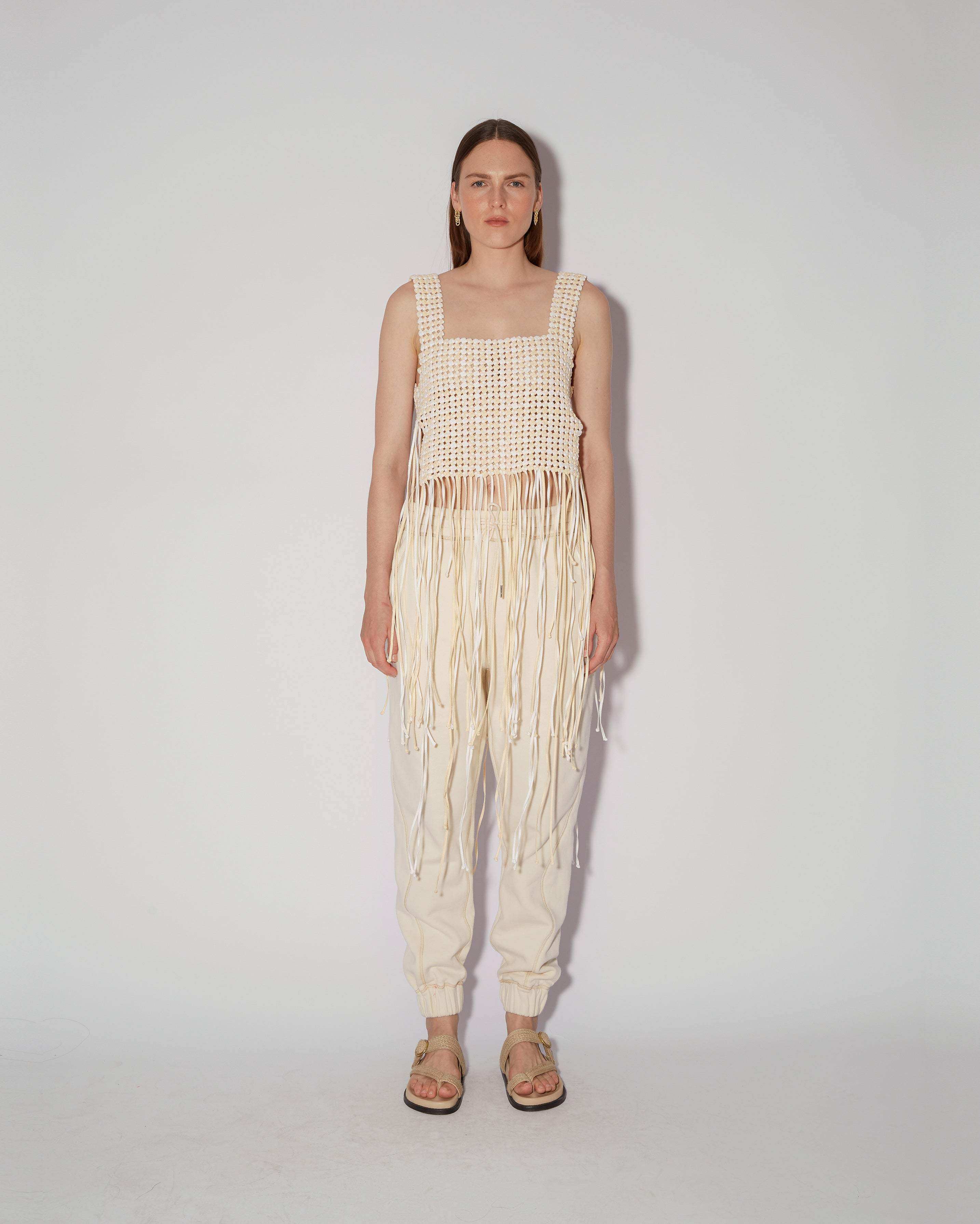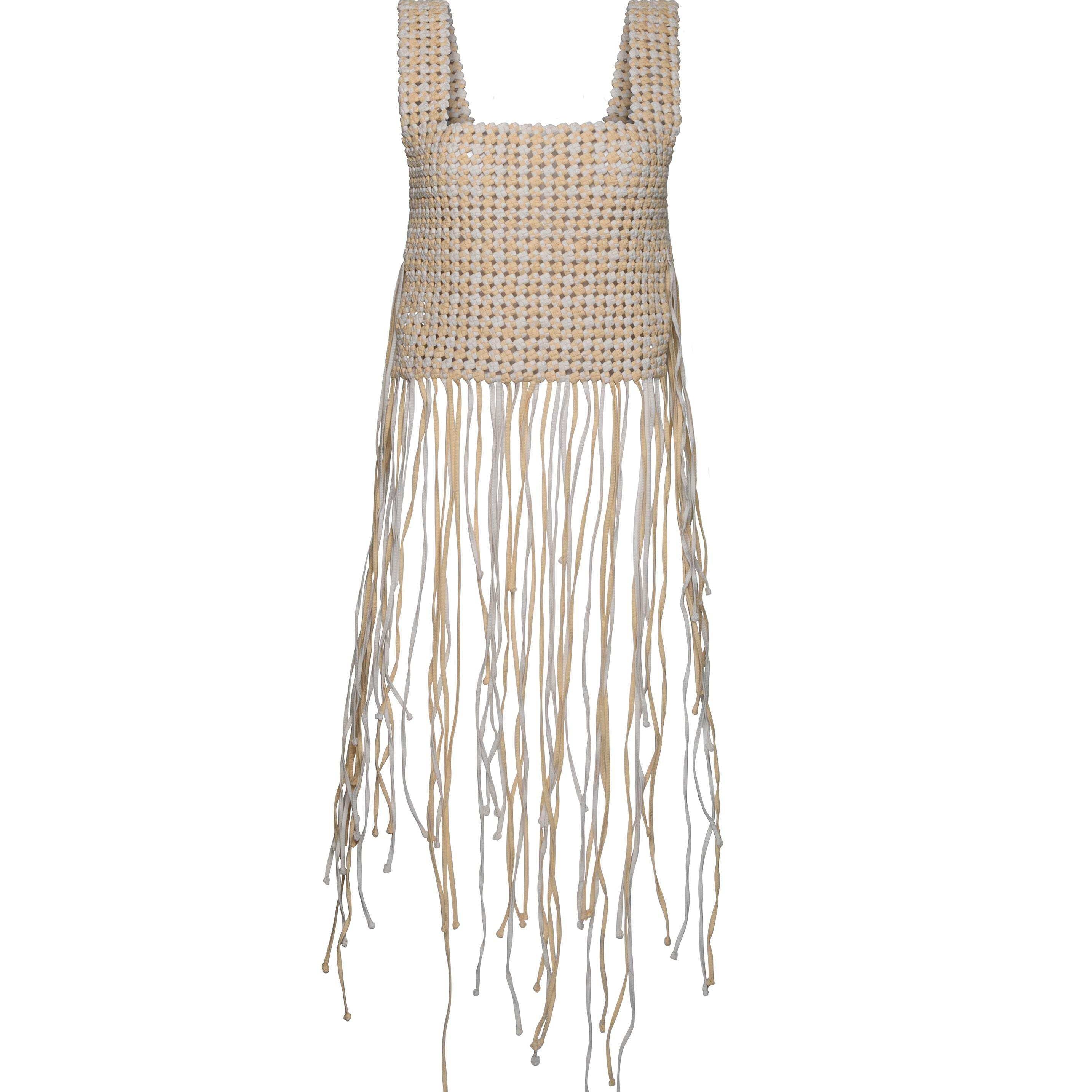 The Mano Top is Magali’s interpretation of the traditional macramé technique, blending artisan craftsmanship with elevated designs. This top uses the same braiding technique, and each cotton string is used to its entirety making it a zero-waste piece. The boxy shape features wide shoulder straps and a square collar.