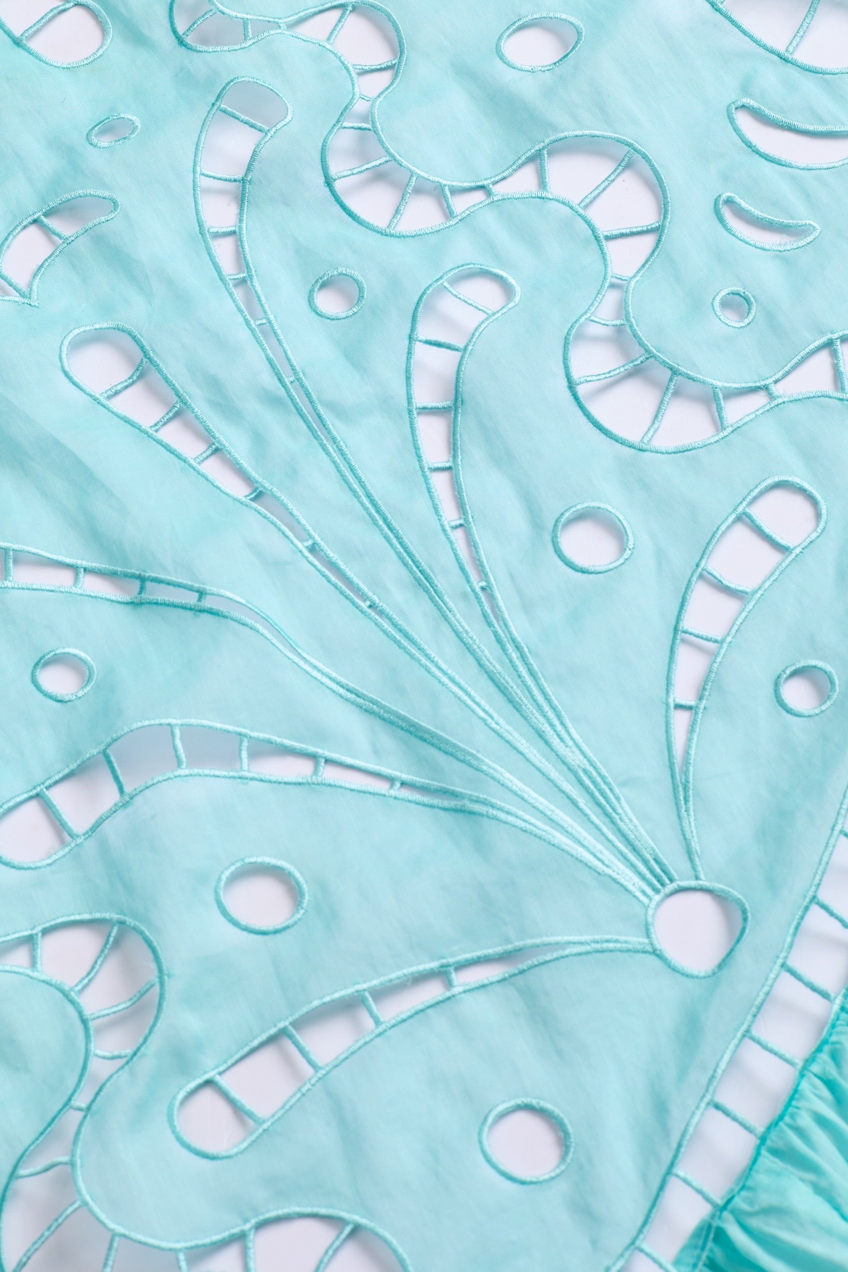 The Miranda Maxi Dress blends feminine structure with flowing movement, featuring signature cut-out embroidery and a high-low hem inspired by the rhythm of Brazilian design.