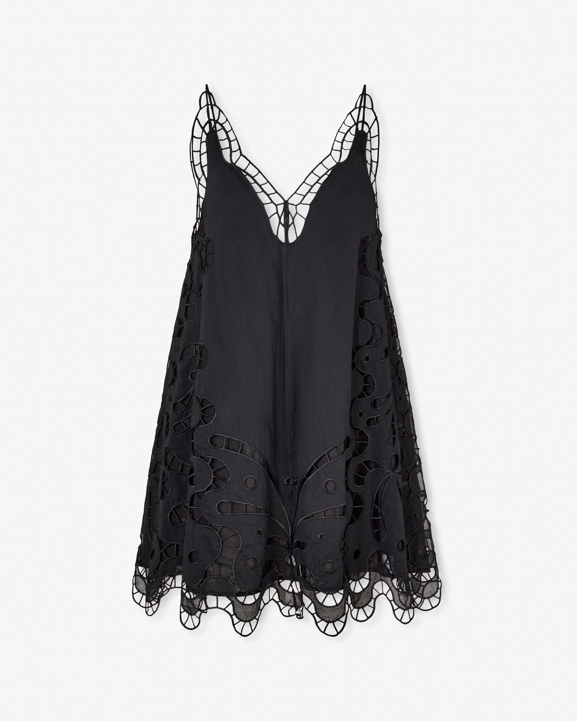 The Miranda Mini Dress features a relaxed silhouette elevated by delicate cut-out embroidery, offering a playful yet elegant look in bright, joyful color.