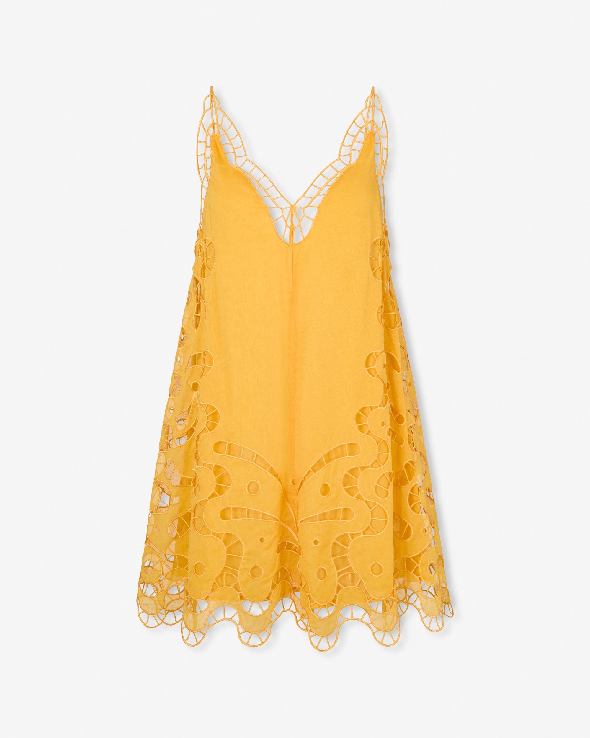 The Miranda Mini Dress features a relaxed silhouette elevated by delicate cut-out embroidery, offering a playful yet elegant look in bright, joyful color.