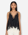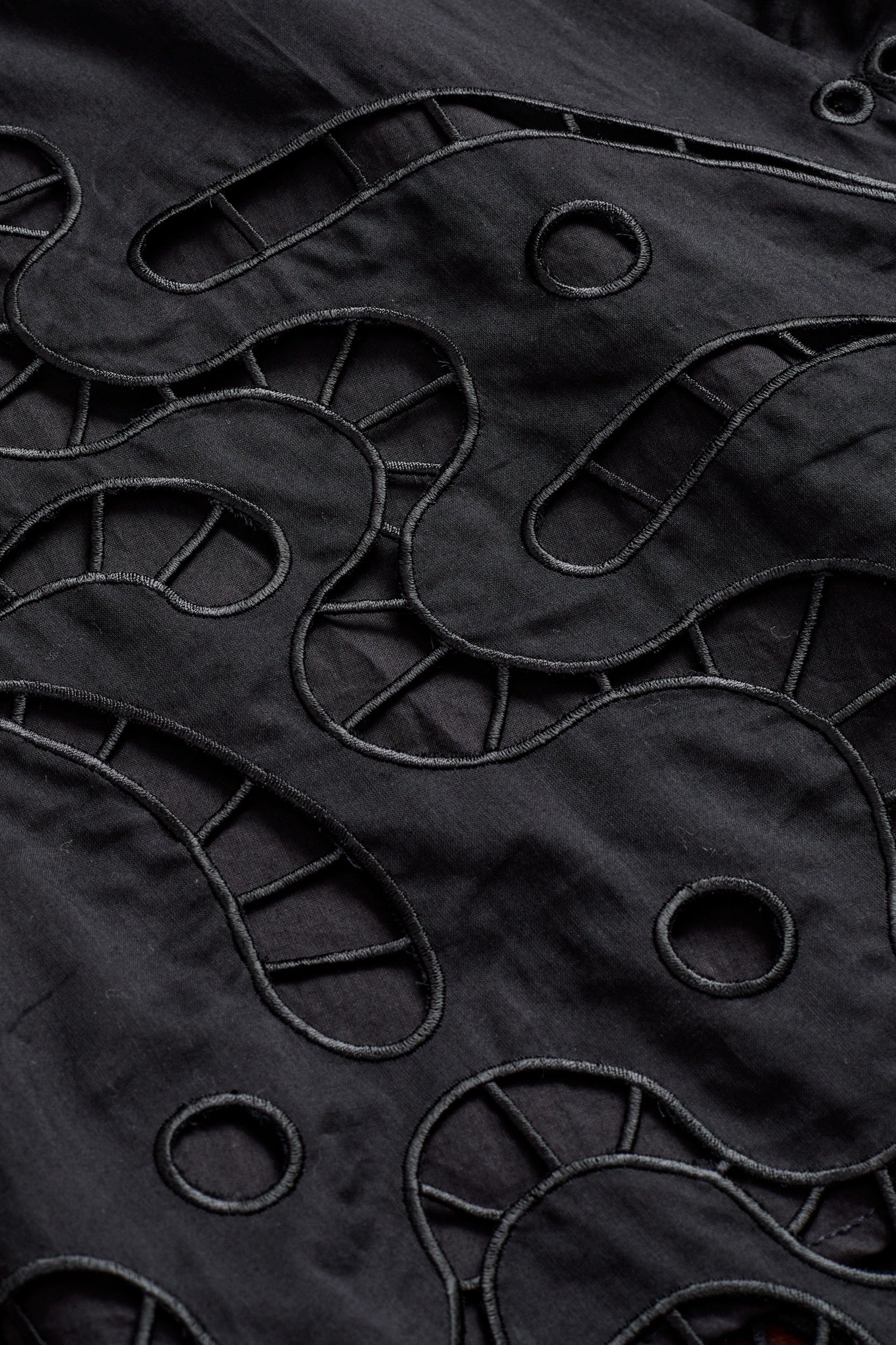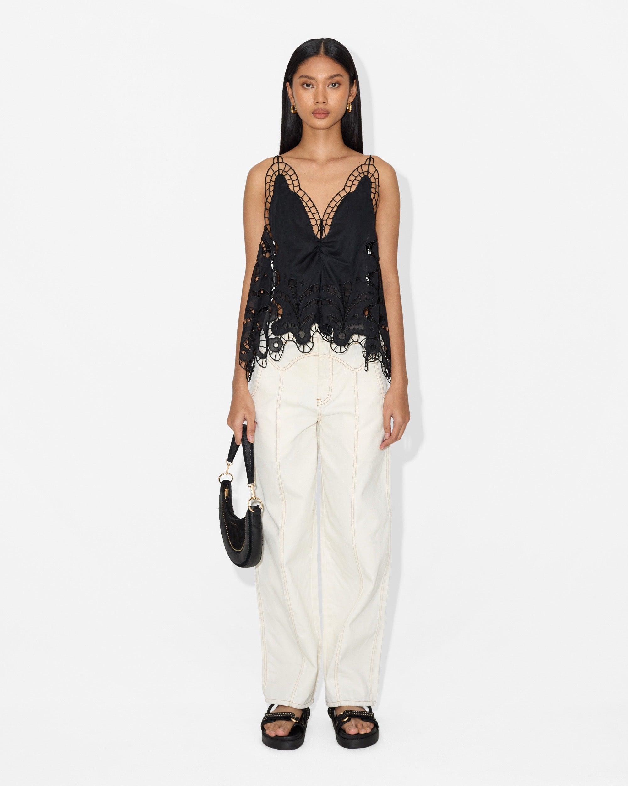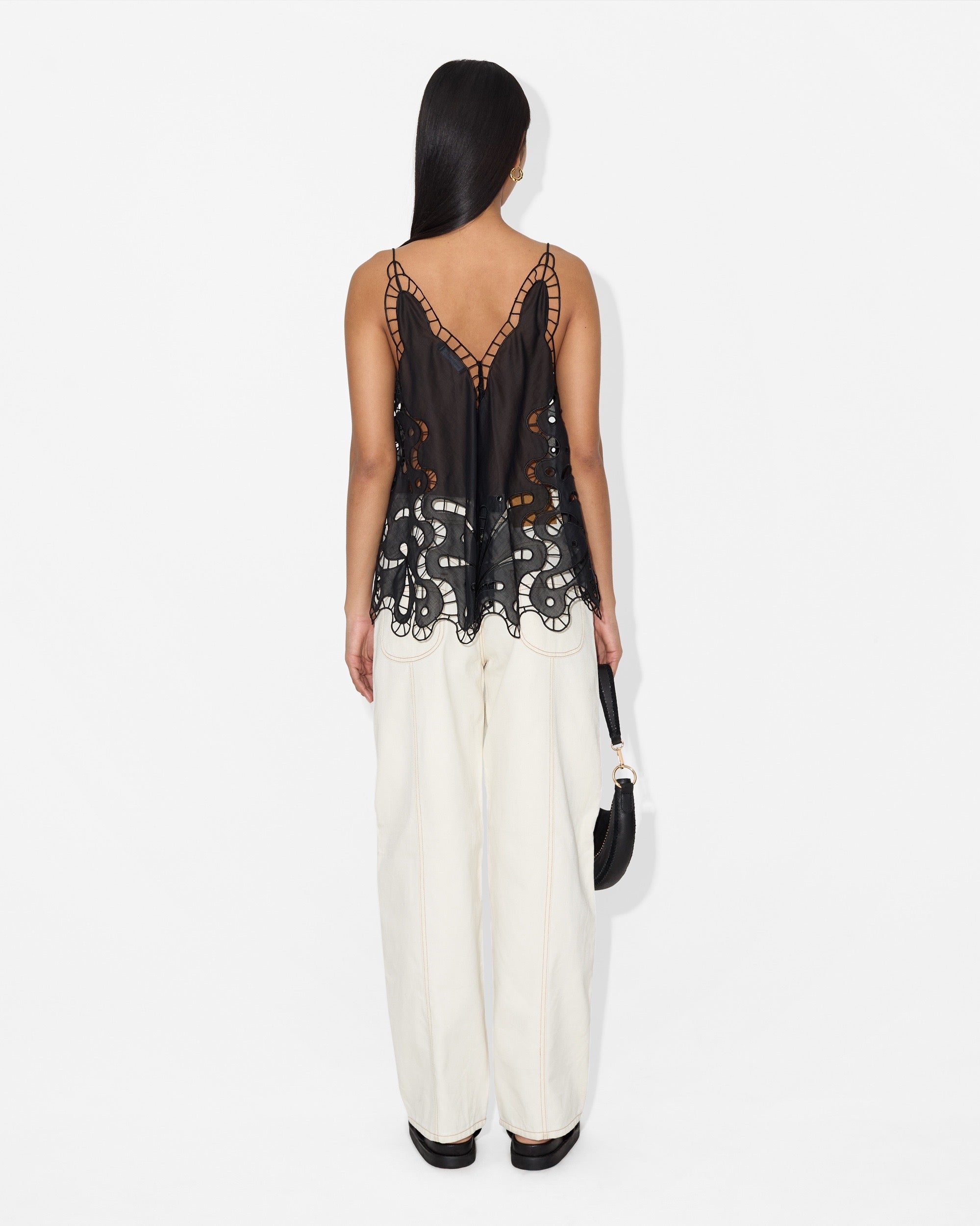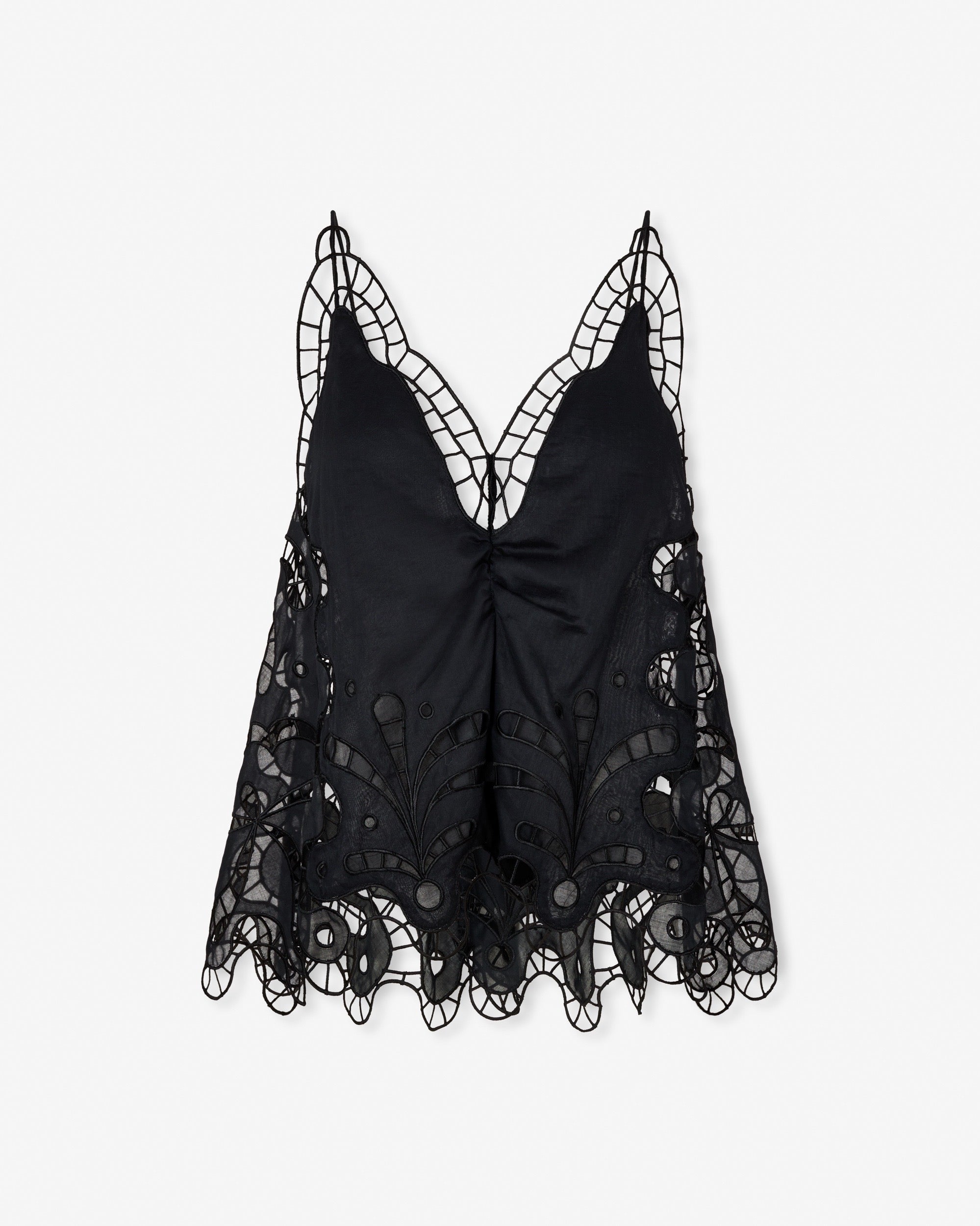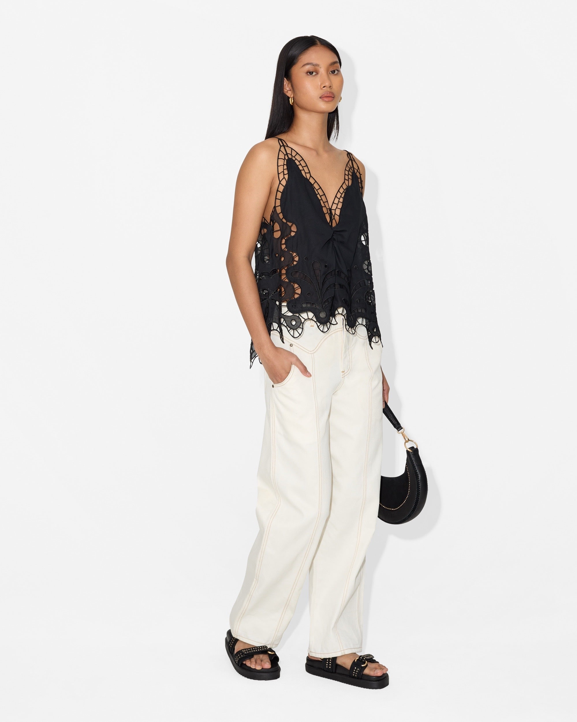 The Miranda Top highlights intricate cut-out embroidery inspired by the flowing patterns of Copacabana pavement, bringing a playful yet refined statement to a relaxed silhouette.