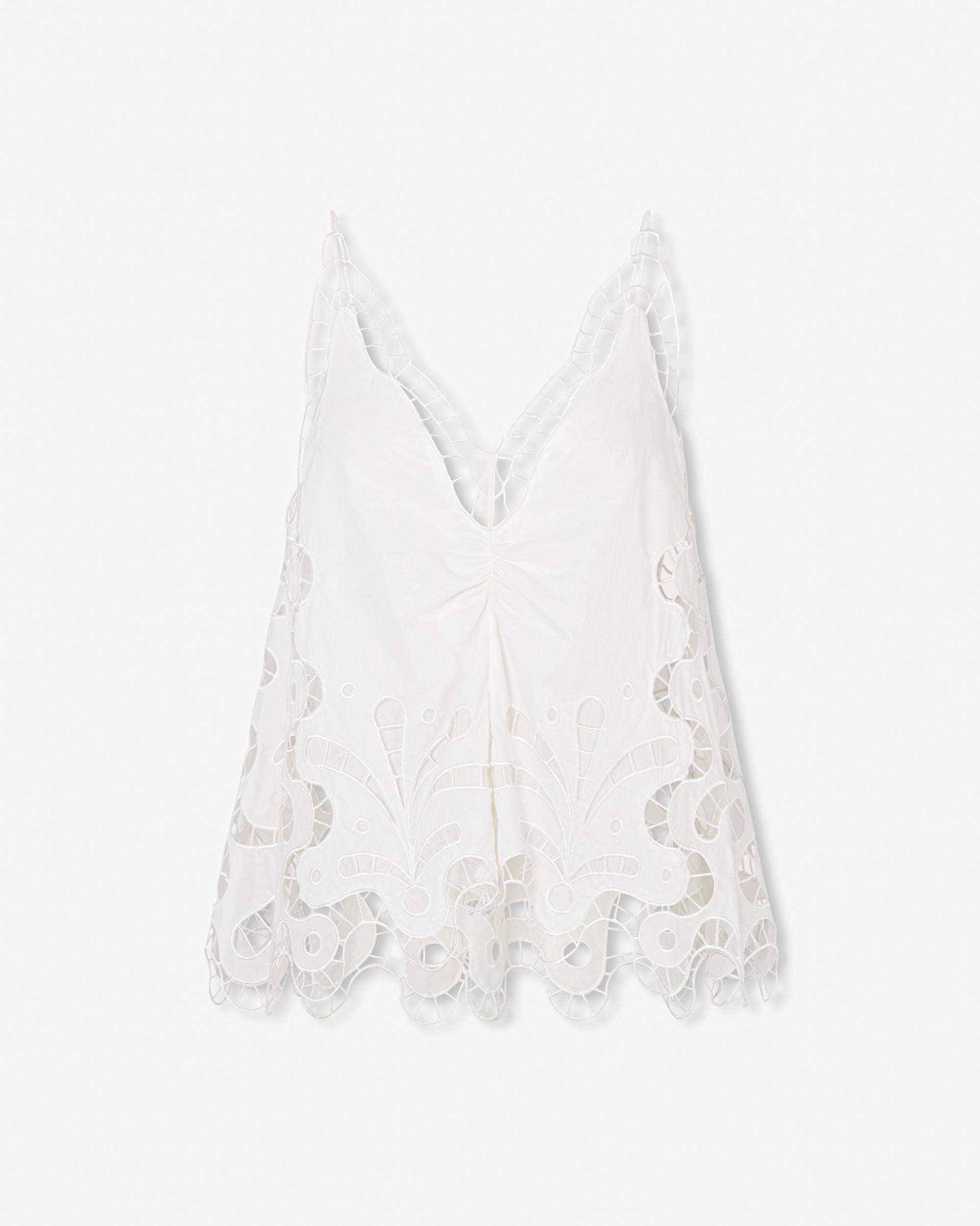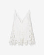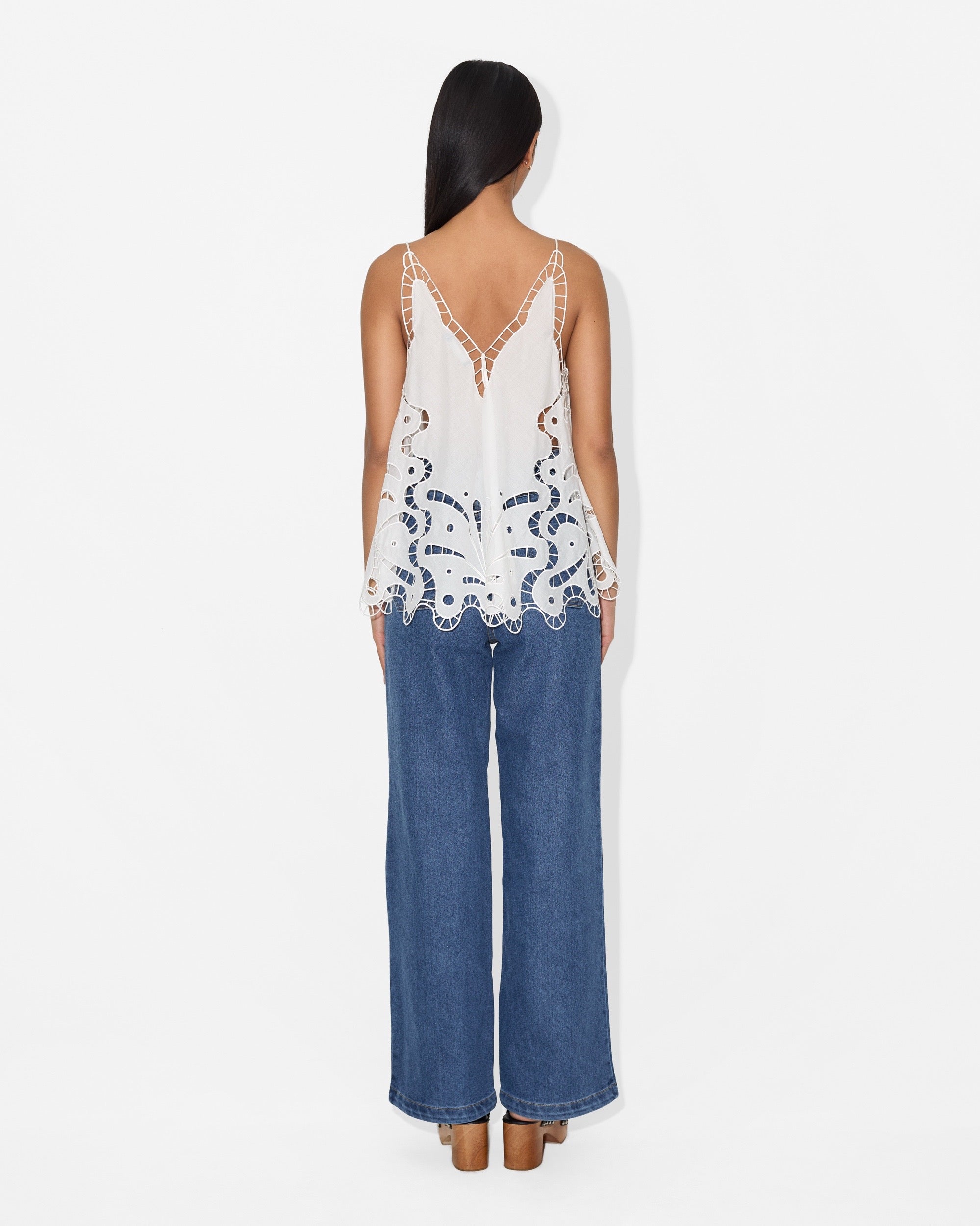 The Miranda Top highlights intricate cut-out embroidery inspired by the flowing patterns of Copacabana pavement, bringing a playful yet refined statement to a relaxed silhouette.