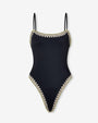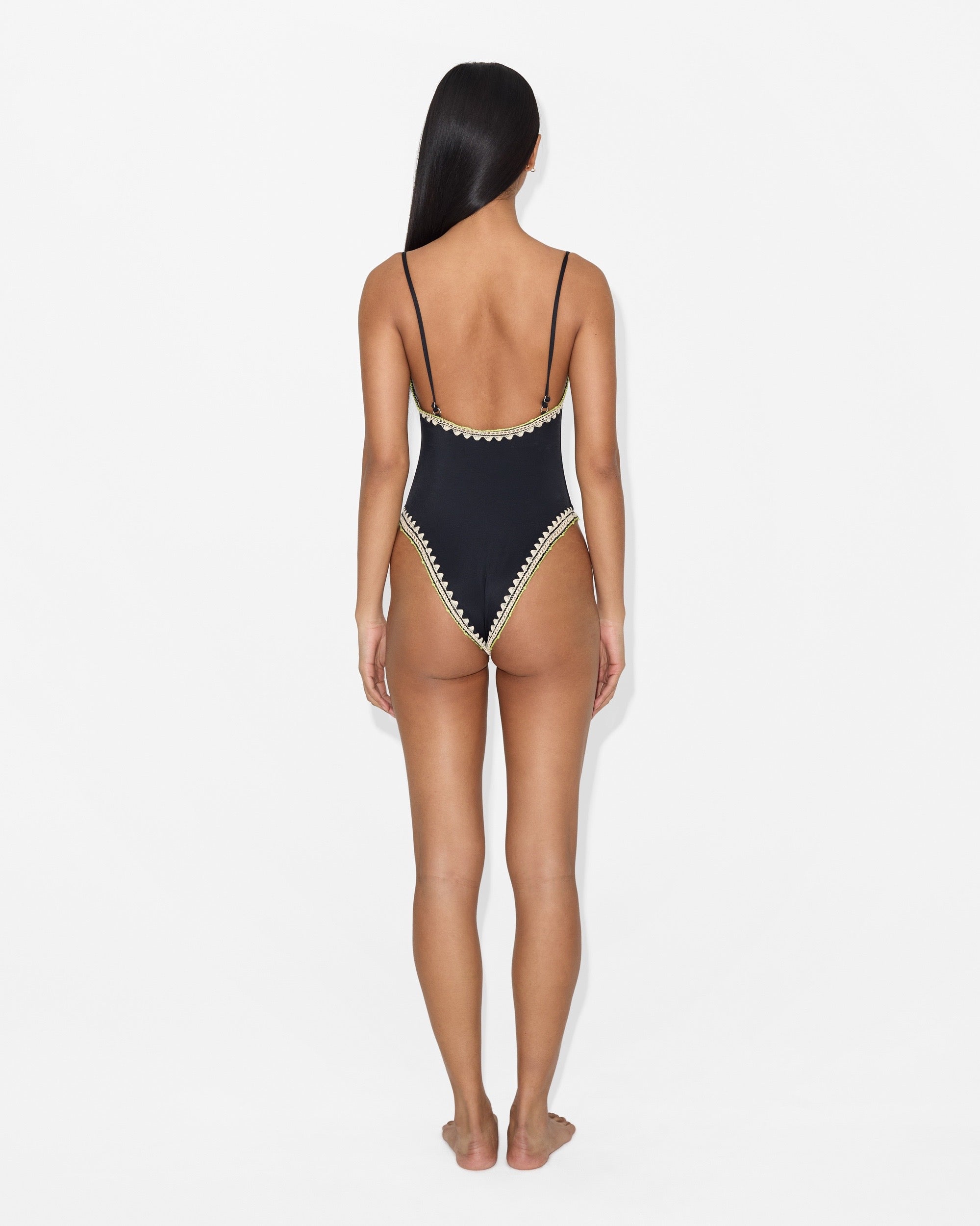 The Praia One Piece blends clean swimwear lines with handcrafted detail, featuring delicate crochet edging that adds a refined, artisanal touch to a modern silhouette.