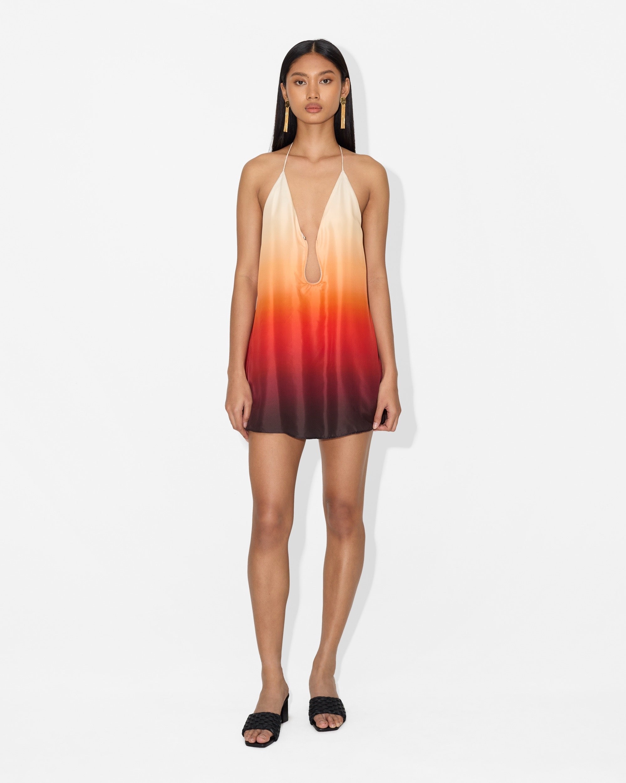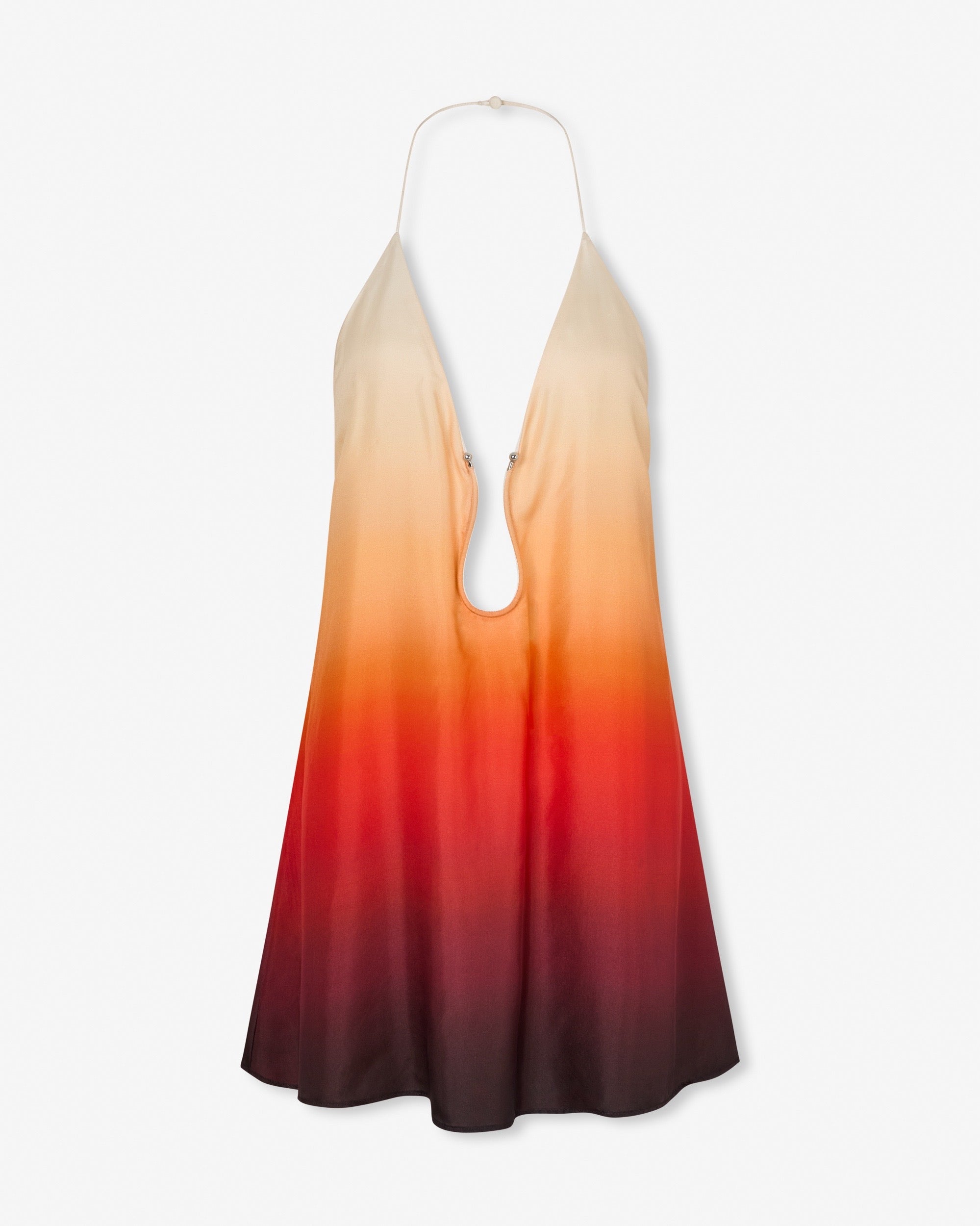 The Robin Mini Dress in Sunset Ombre captures the warmth of a glowing sunset through its fluid silk silhouette. Designed with a striking backless cut and a soft ombré gradient, the piece feels both effortless and alluring.