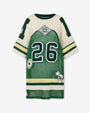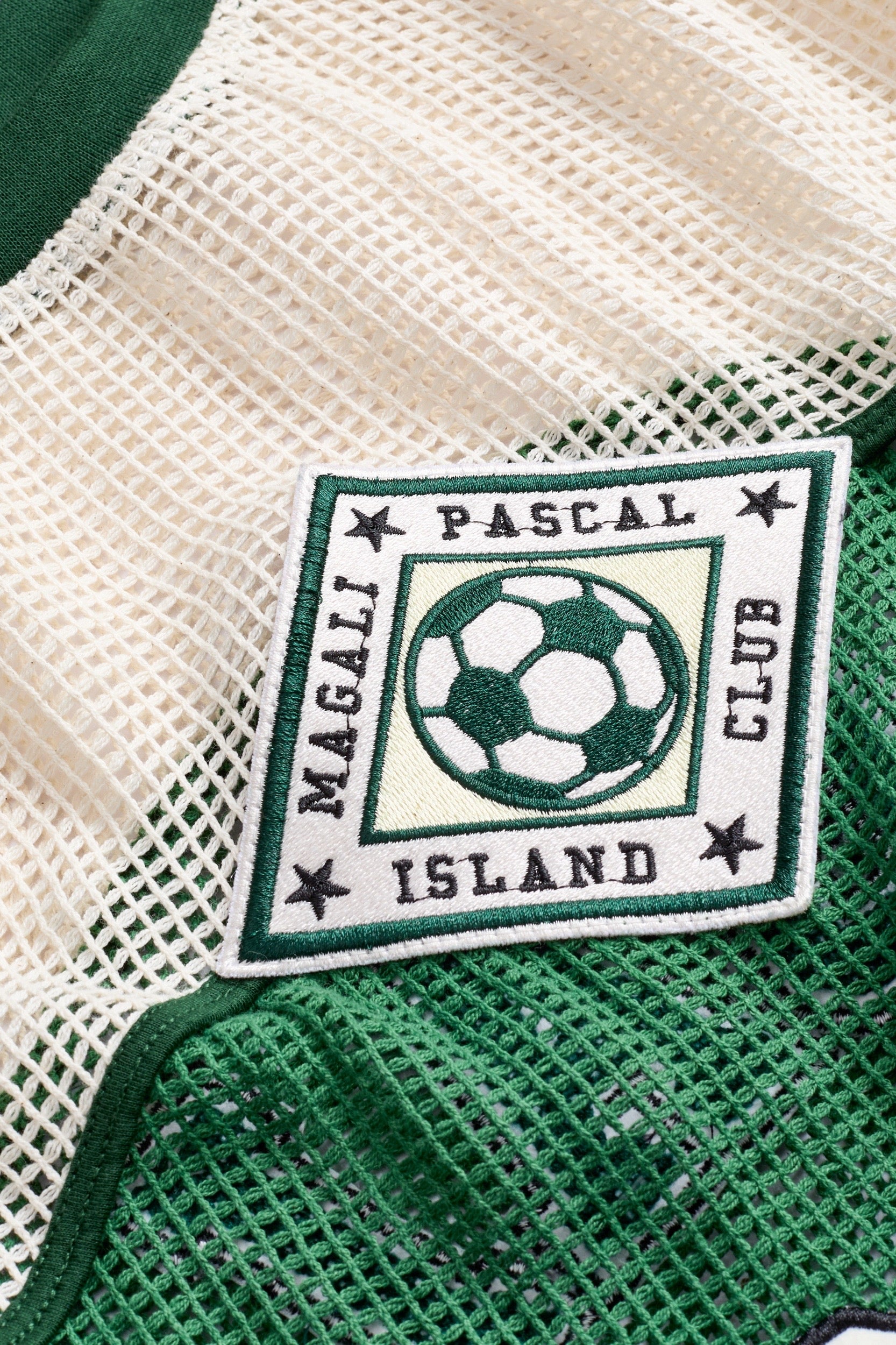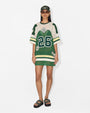 The Ronaldo T-Shirt Dress reimagines classic sportswear through a feminine oversized silhouette, celebrating Brazilian football culture with bold embroidery and textured mesh.