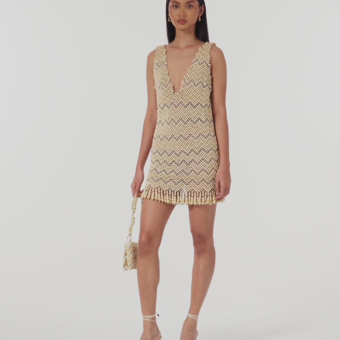 Beaded fringe detail at hem for fluid movement.
